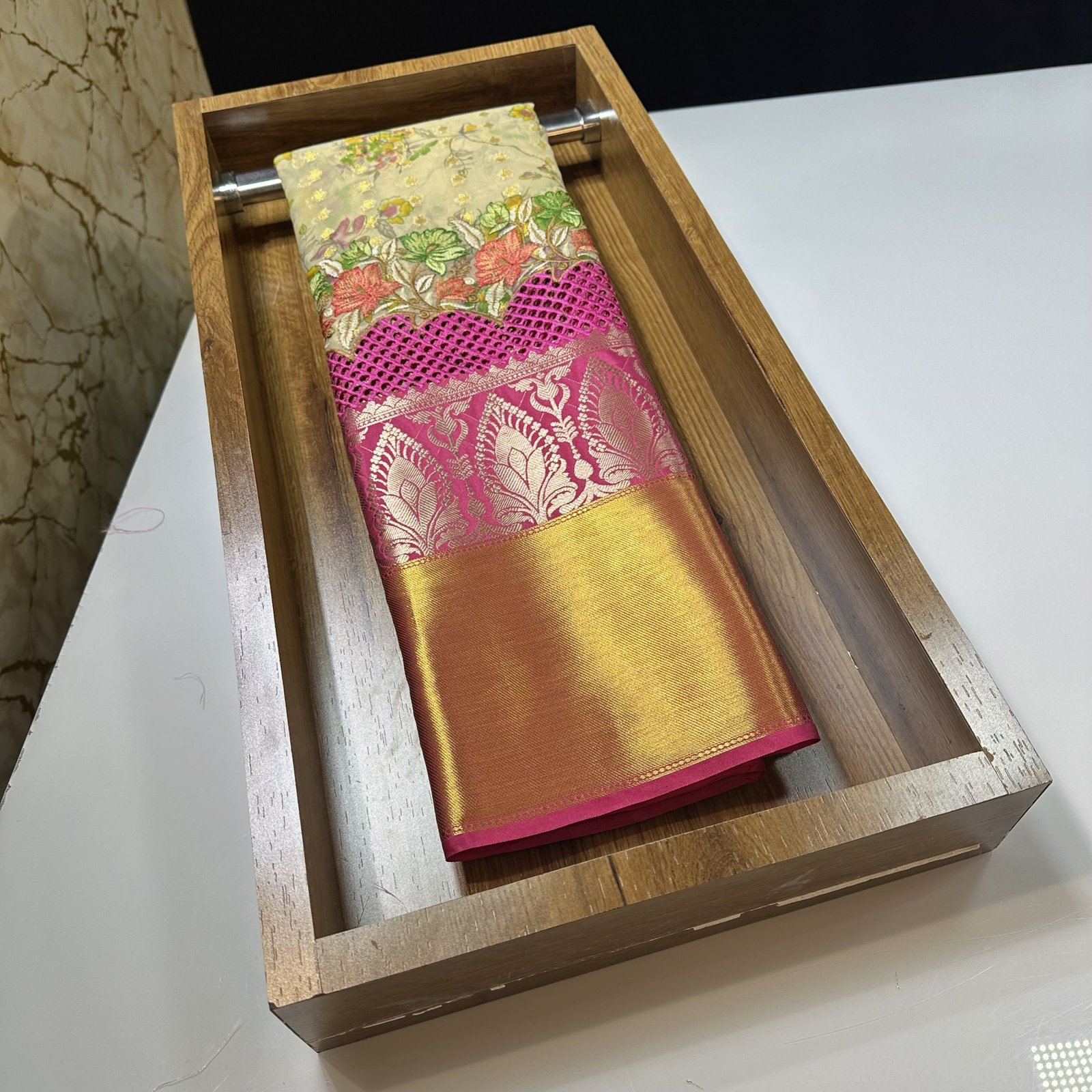 SOFT SEMI-KANCHI KORA SILK SAREE WITH EMBROIDERY WORK AND CUTWORK OVER WEAVING KANCHI BIG BORDER