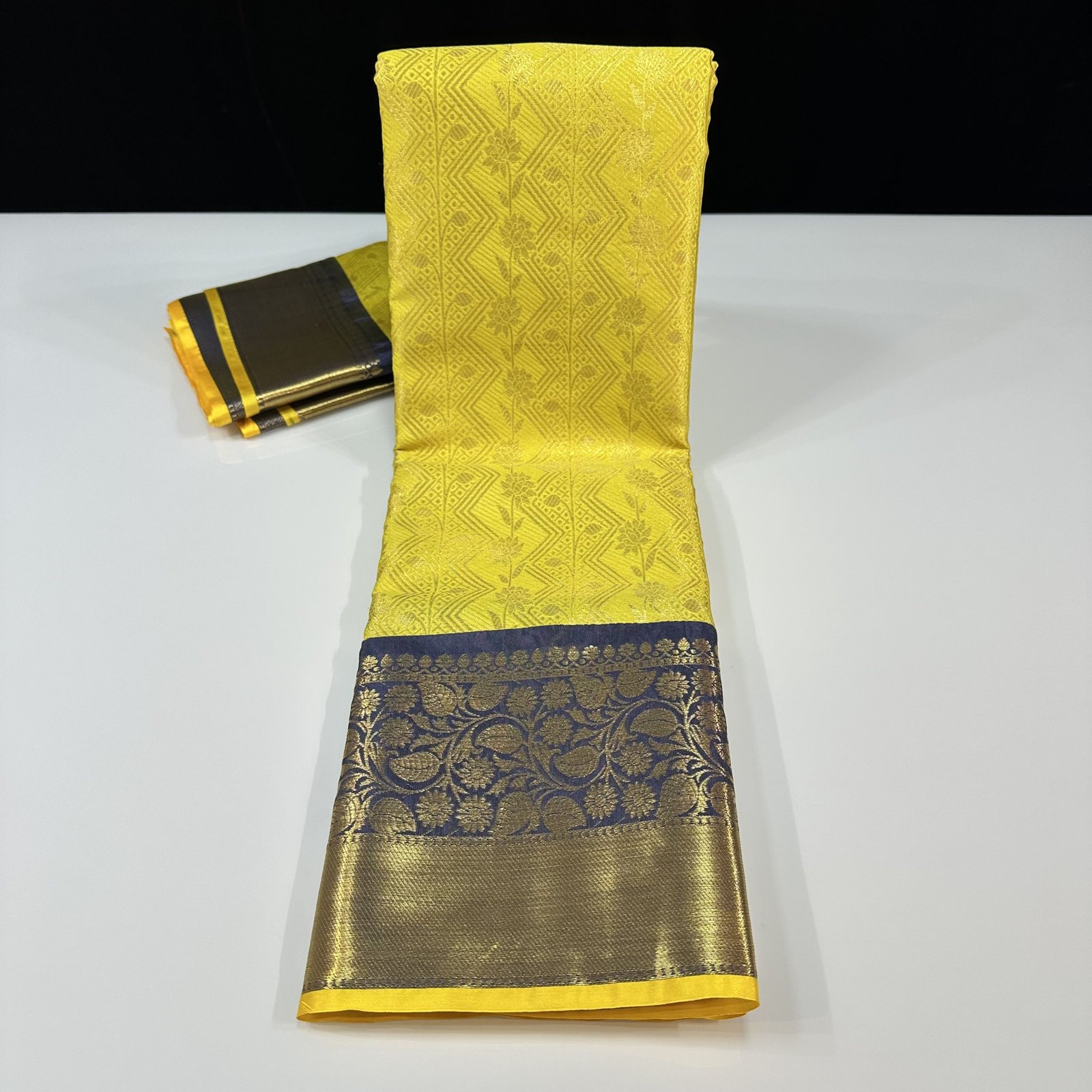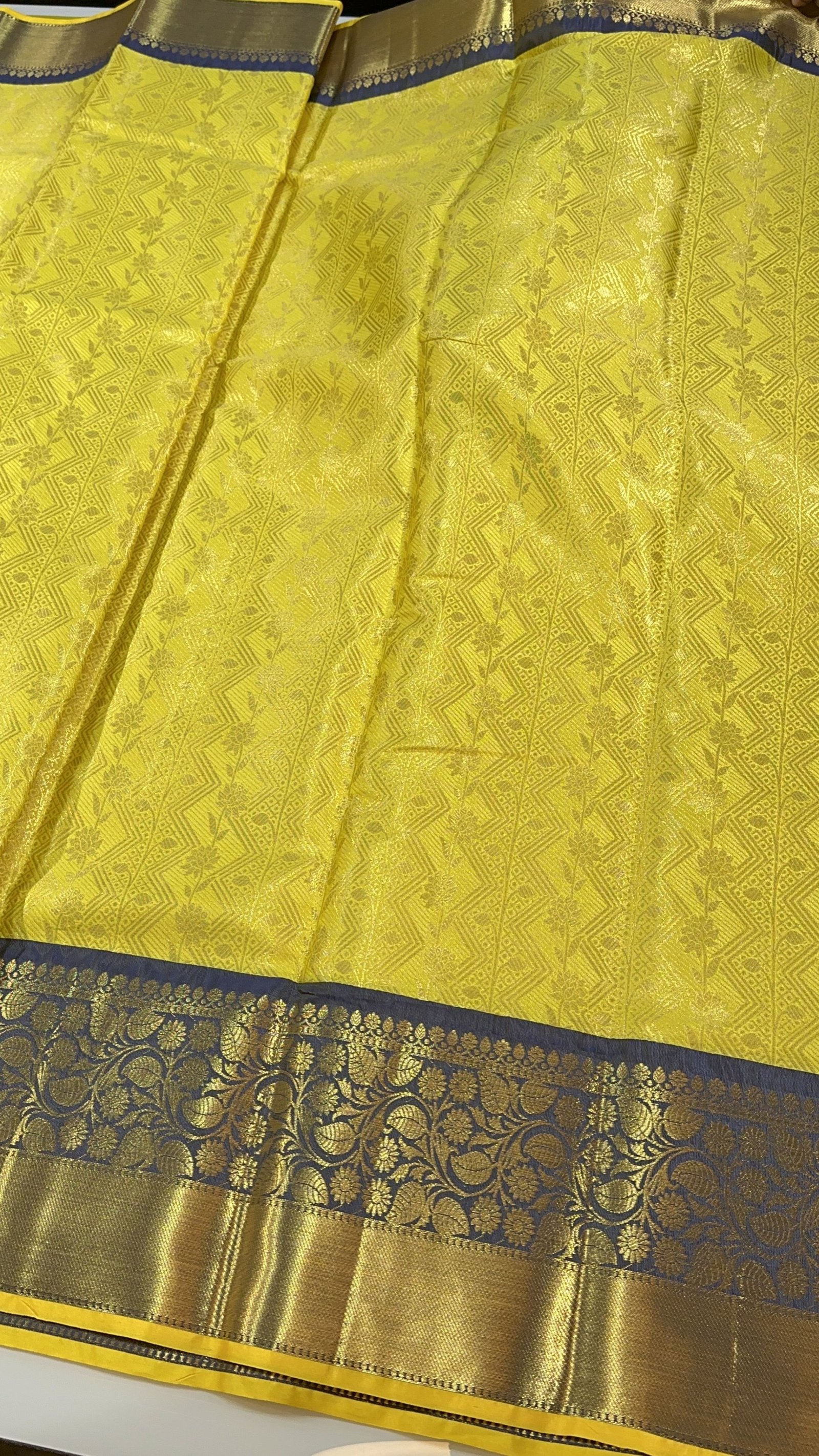 The highlight of this masterpiece is its contrast kanchi weave border, meticulously designed to add depth and definition to the drape. The striking border enhances the saree’s overall appeal, creating a perfect balance between classic Banarasi charm and South Indian kanchi aesthetics.