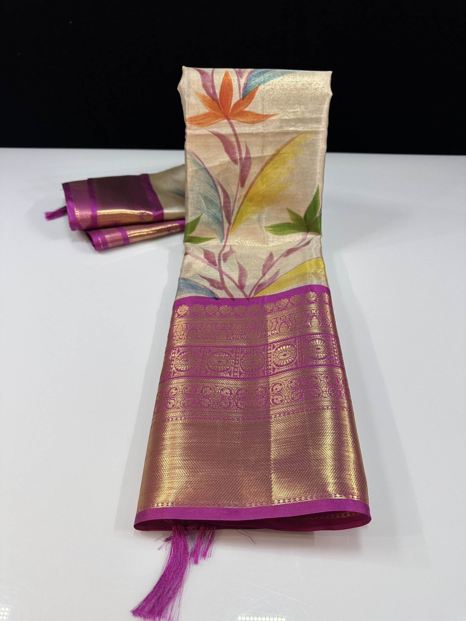 A soft and lightweight Banarasi tissue silk saree featuring an elegant hand-painted jaal pattern flowing across the body. The delicate artwork is beautifully complemented by a contrast border inspired by classic Kanchi designs, adding a refined traditional touch. Easy to drape and graceful in appeal, this saree is perfect for effortless elegance with artistic charm.