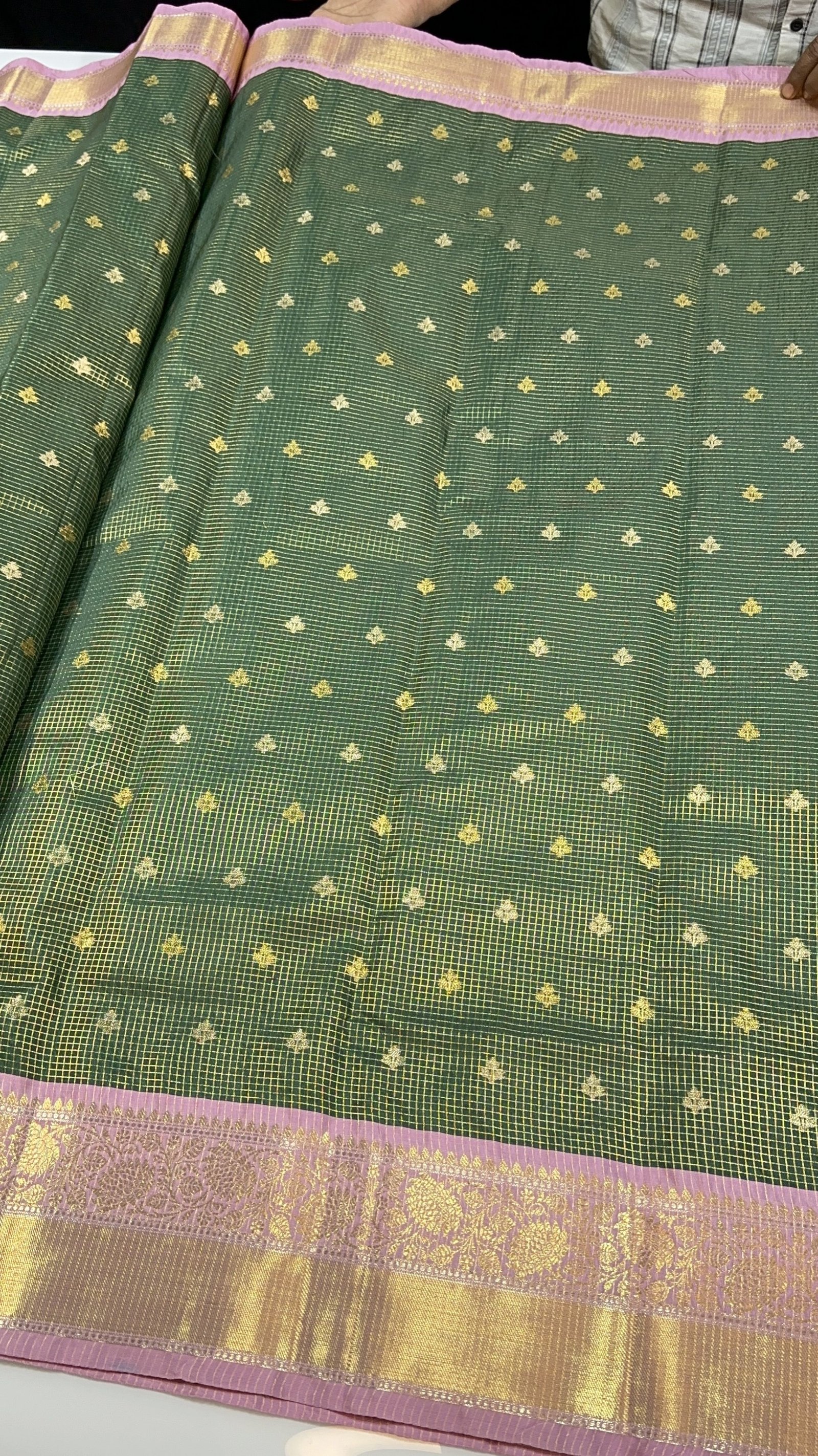 Presenting a soft Banarasi saree in a charming vintage-inspired checks pattern, beautifully reflecting the timeless elegance of traditional Banarasi craftsmanship. The body of the saree features delicate zari weaving small motifs in a classic Sonarupa pattern, where golden and silver zari come together harmoniously, adding a subtle yet luxurious sparkle to the fabric.