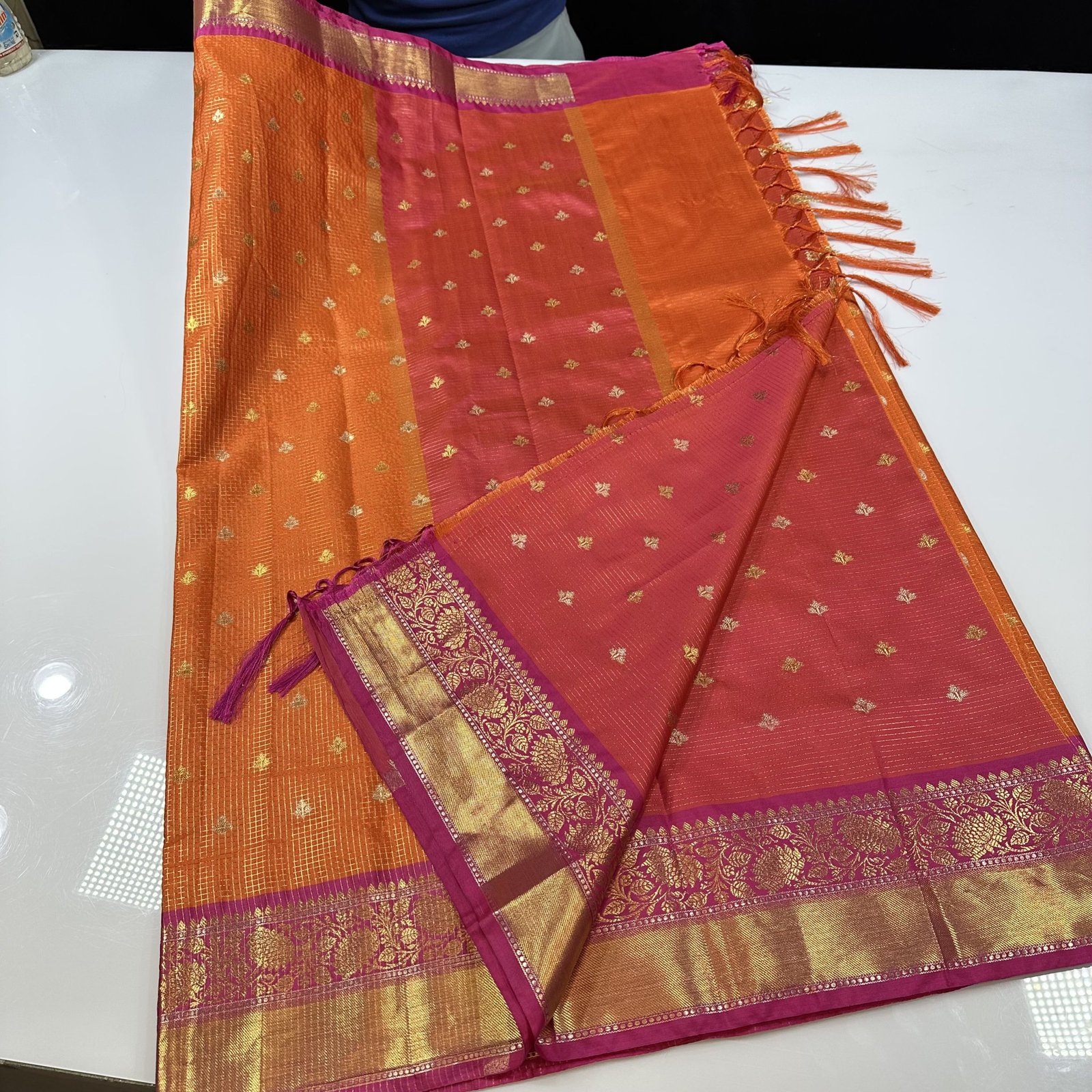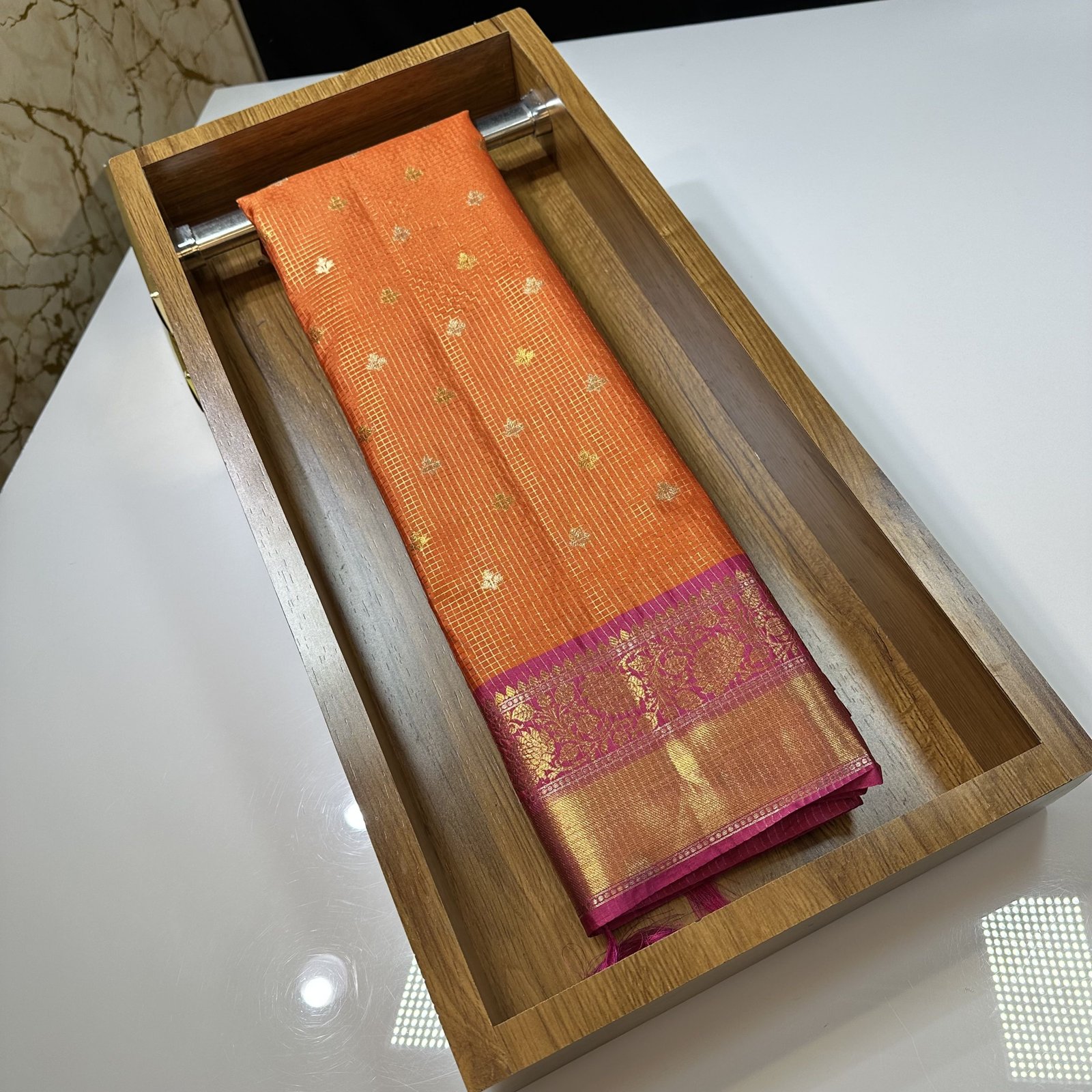 The vintage checks layout gives the saree a graceful old-world appeal, while the finely woven Sonarupa motifs enhance its richness and texture. Crafted in a soft and comfortable drape, this saree perfectly balances heritage artistry with understated elegance.