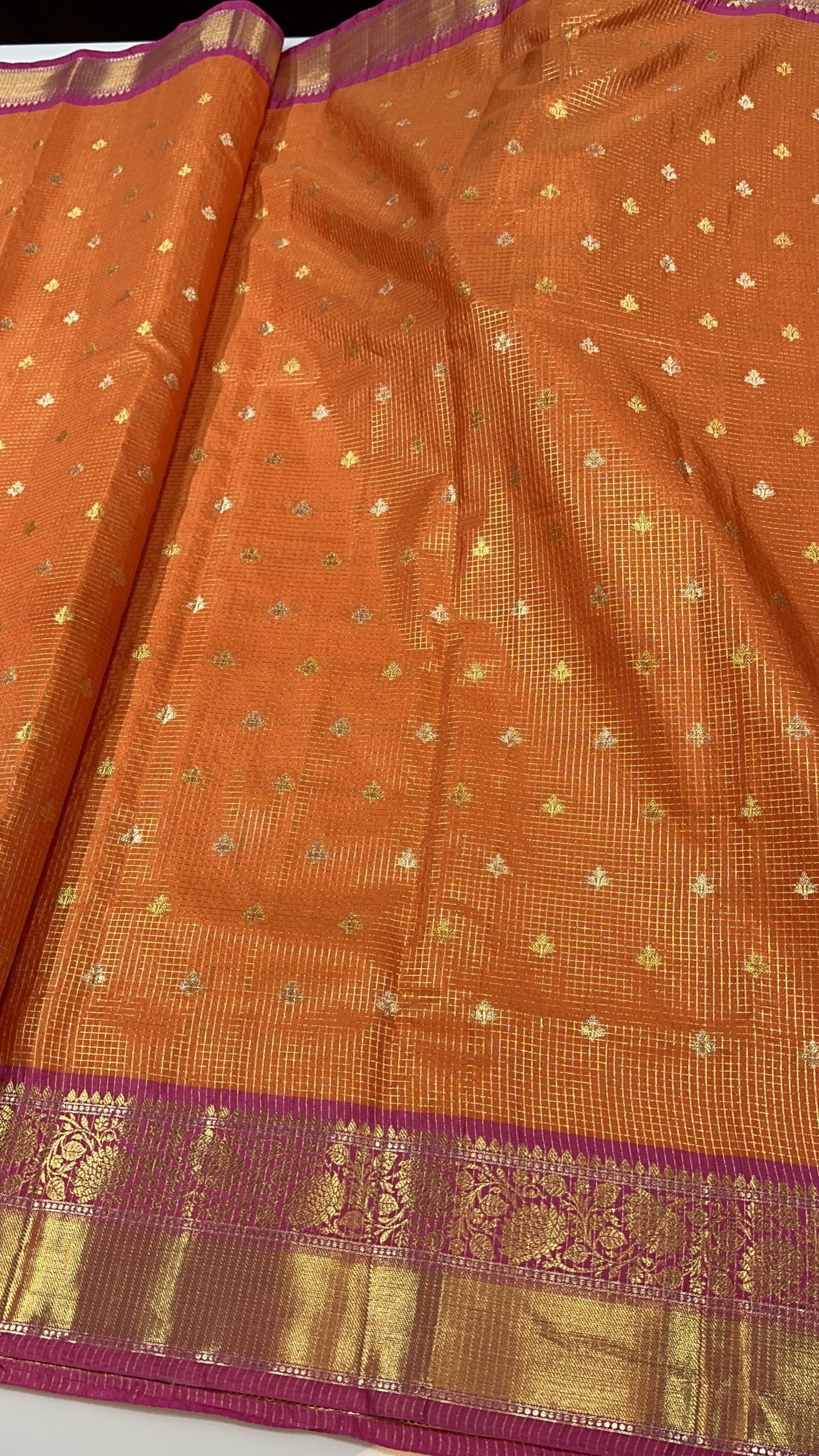 Presenting a soft Banarasi saree in a charming vintage-inspired checks pattern, beautifully reflecting the timeless elegance of traditional Banarasi craftsmanship. The body of the saree features delicate zari weaving small motifs in a classic Sonarupa pattern, where golden and silver zari come together harmoniously, adding a subtle yet luxurious sparkle to the fabric. The vintage checks layout gives the saree a graceful old-world appeal, while the finely woven Sonarupa motifs enhance its richness and texture. Crafted in a soft and comfortable drape, this saree perfectly balances heritage artistry with understated elegance.