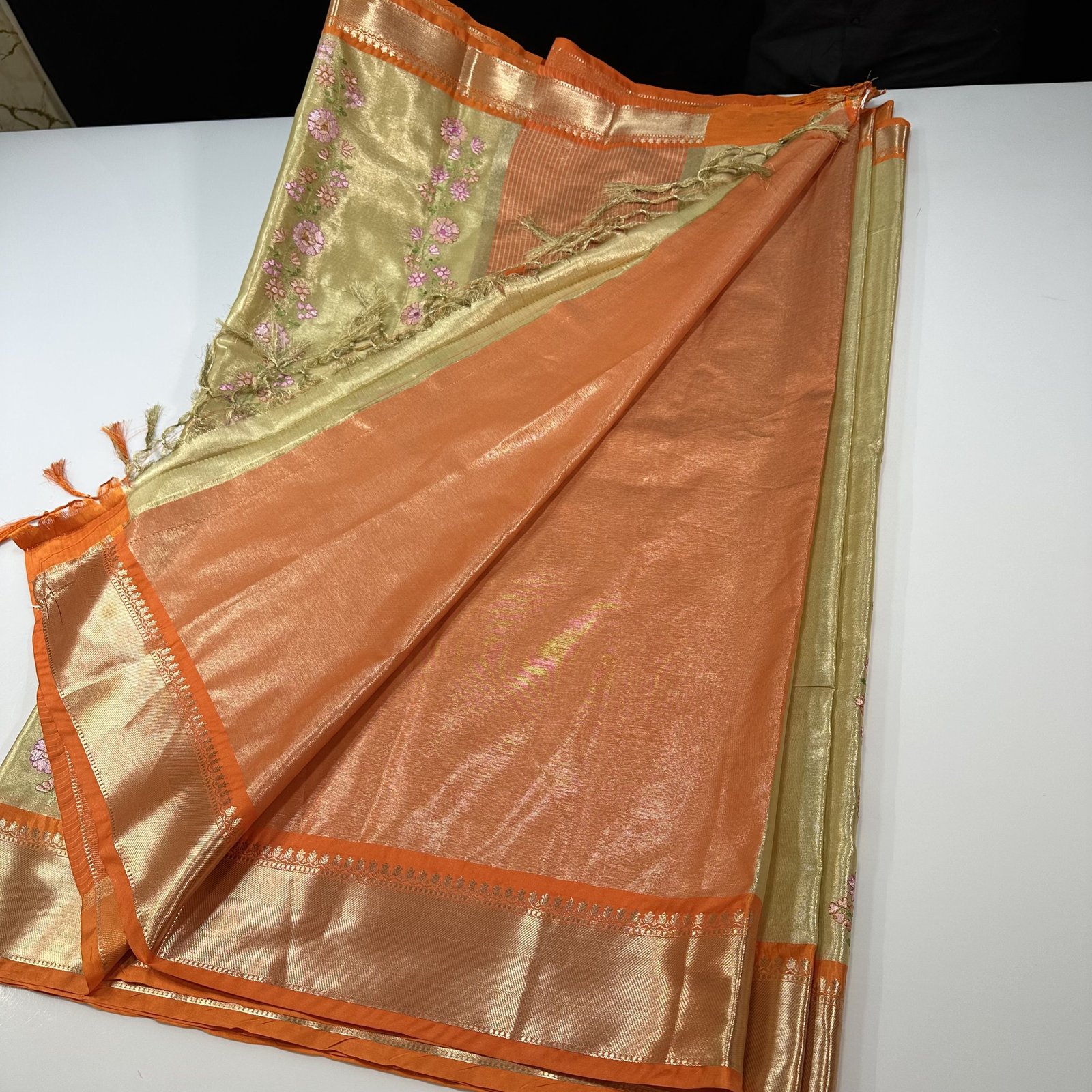 SOFT BANARASI TISSUE SILK SAREE WITH CONTRAST WEAVING SMALL ZARI BORDER WITH EMBROIDERY WORK JAAL OVER BODY