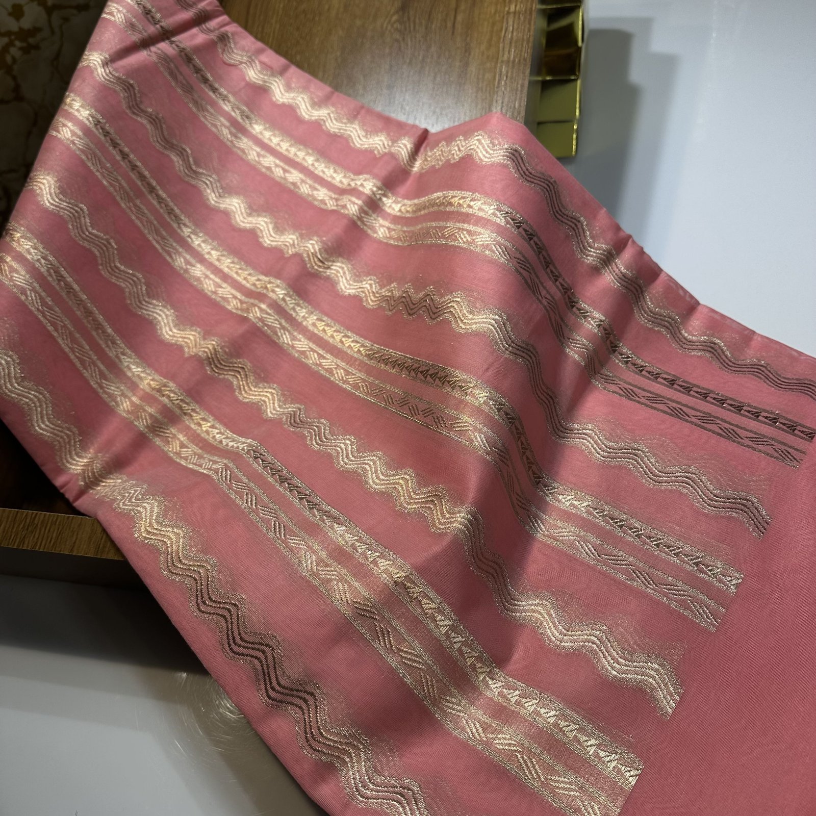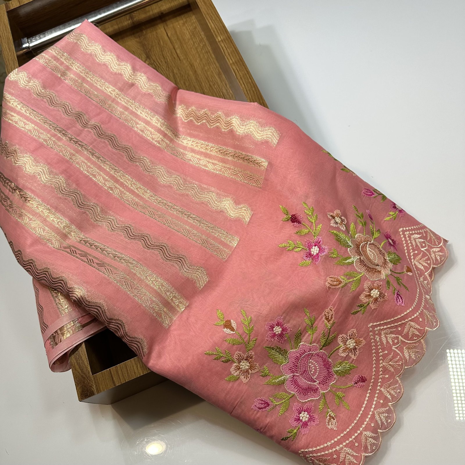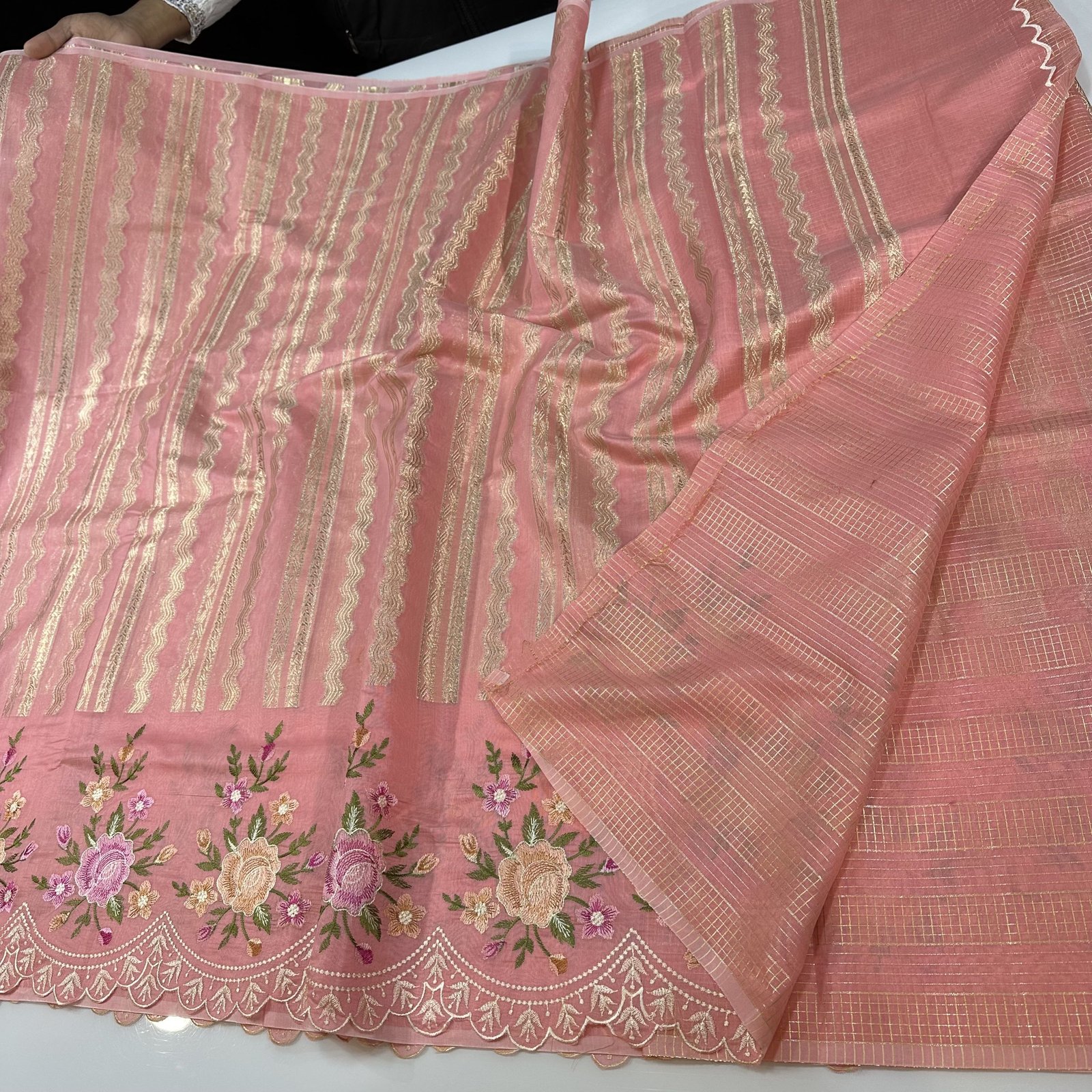 Experience timeless elegance with this soft Banarasi cotton saree, beautifully blending comfort with craftsmanship. The body of the saree features delicate zari-woven stripes that add a subtle shimmer and graceful texture to the drape. Highlighting its charm is the intricate meenakari BUTA embroidery adorning both the border and scattered across the saree, bringing vibrant detailing and artisanal finesse. The finely finished scallop border enhances its feminine appeal, giving it a refined and designer touch. Lightweight, breathable, and effortlessly stylish, this saree is perfect for festive gatherings, daytime celebrations, and elegant occasions.