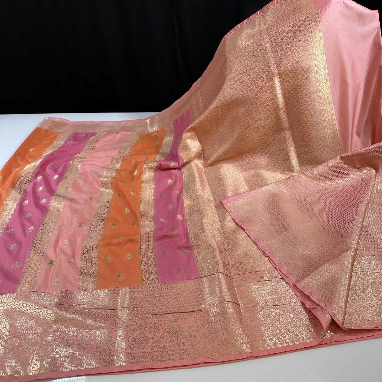A soft Banarasi semi-katan silk saree that beautifully blends traditional weaving with artistic expression. The body of the saree features elegant zari weaving stripes running gracefully throughout, highlighted with intricately crafted zari buta motifs that add richness and depth. The semi-katan silk fabric is soft, smooth, and luxurious, offering a refined drape with a graceful fall.