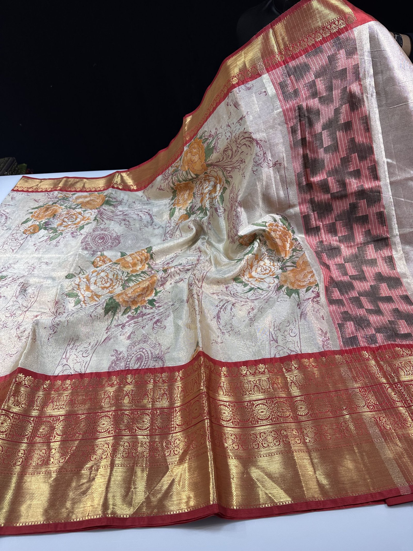 SOFT BANARASI TISSUE SILK SAREE WITH DIGITAL PRINTED JAAL ALLOVER SAREE