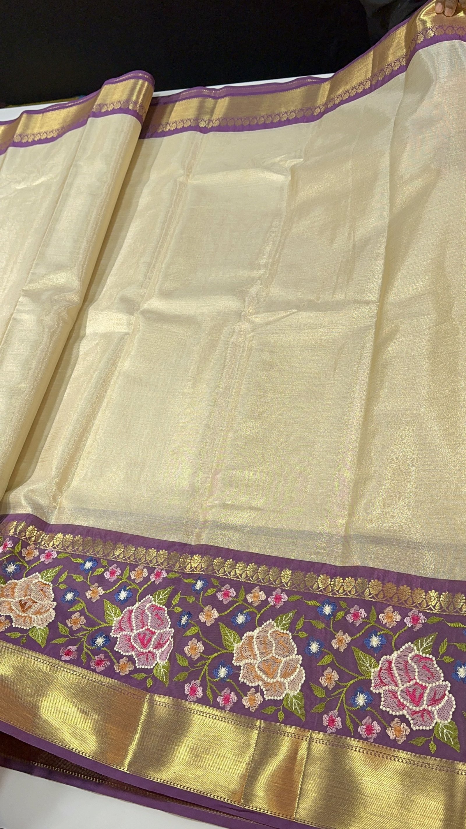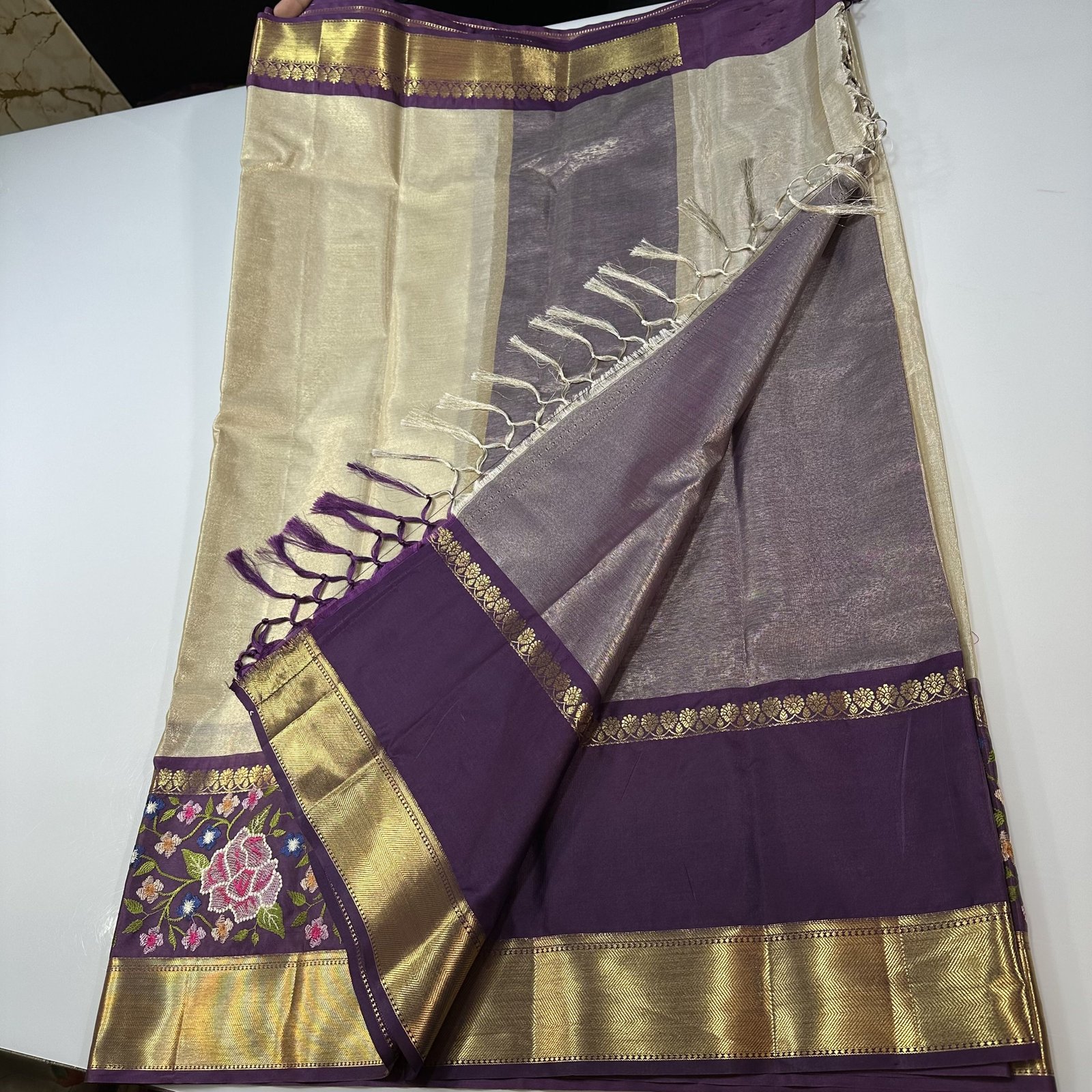 This exquisite Banarasi Tissue Silk Saree radiates elegance with its luminous texture and refined craftsmanship. Woven in rich tissue silk, the saree carries a subtle sheen and a lightweight, graceful drape that feels effortlessly luxurious. The saree is beautifully framed with a contrast Kanchi-inspired border, adding depth and traditional grandeur to the overall look. Enhancing its uniqueness, intricate embroidery work delicately placed in between the border lends an artistic touch, creating a perfect harmony between weaving and hand embellishment. Sophisticated yet timeless, this saree is an ideal choice for festive occasions, celebrations, and elegant evening wear.