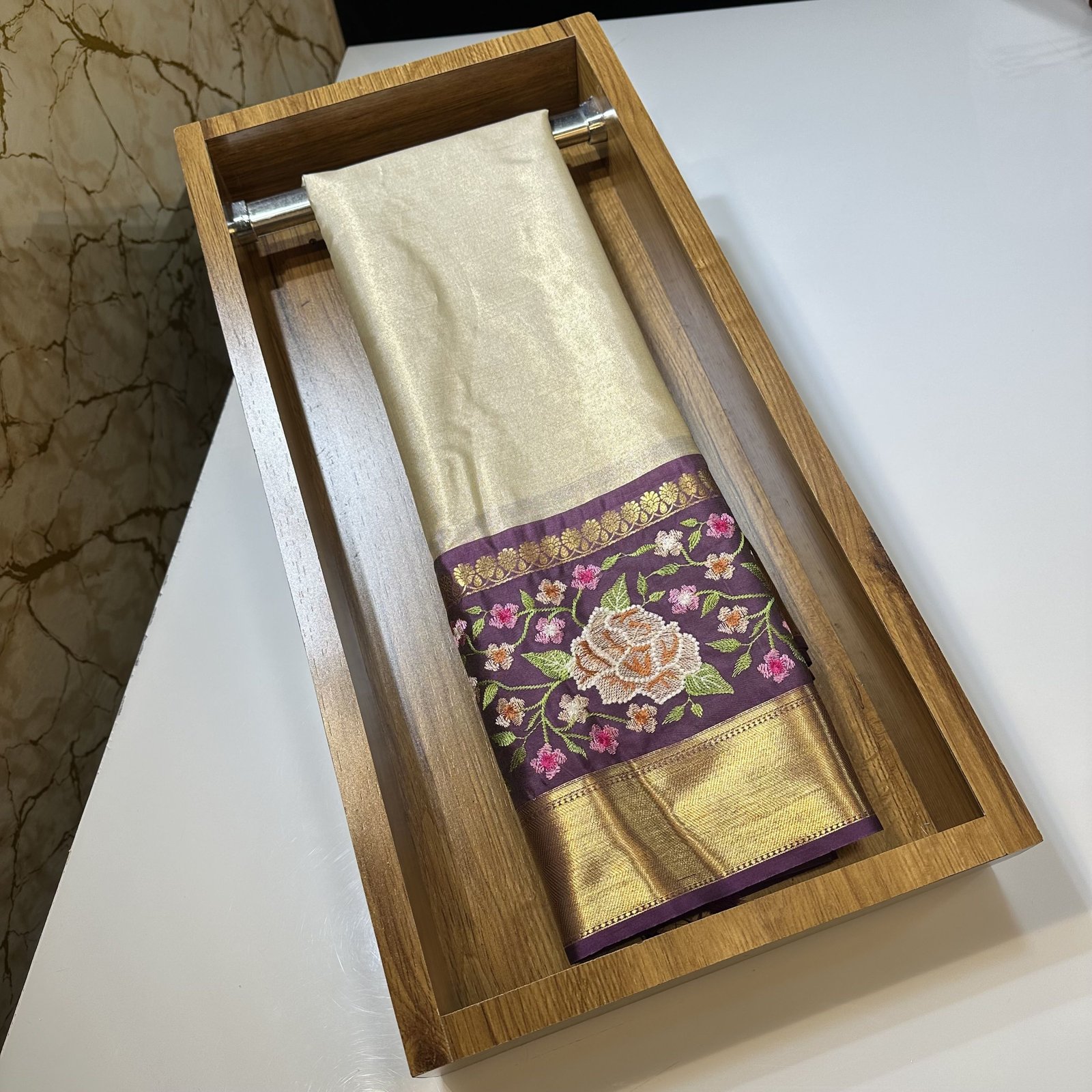 This exquisite Banarasi Tissue Silk Saree radiates elegance with its luminous texture and refined craftsmanship. Woven in rich tissue silk, the saree carries a subtle sheen and a lightweight, graceful drape that feels effortlessly luxurious. The saree is beautifully framed with a contrast Kanchi-inspired border, adding depth and traditional grandeur to the overall look. Enhancing its uniqueness, intricate embroidery work delicately placed in between the border lends an artistic touch, creating a perfect harmony between weaving and hand embellishment. Sophisticated yet timeless, this saree is an ideal choice for festive occasions, celebrations, and elegant evening wear.
