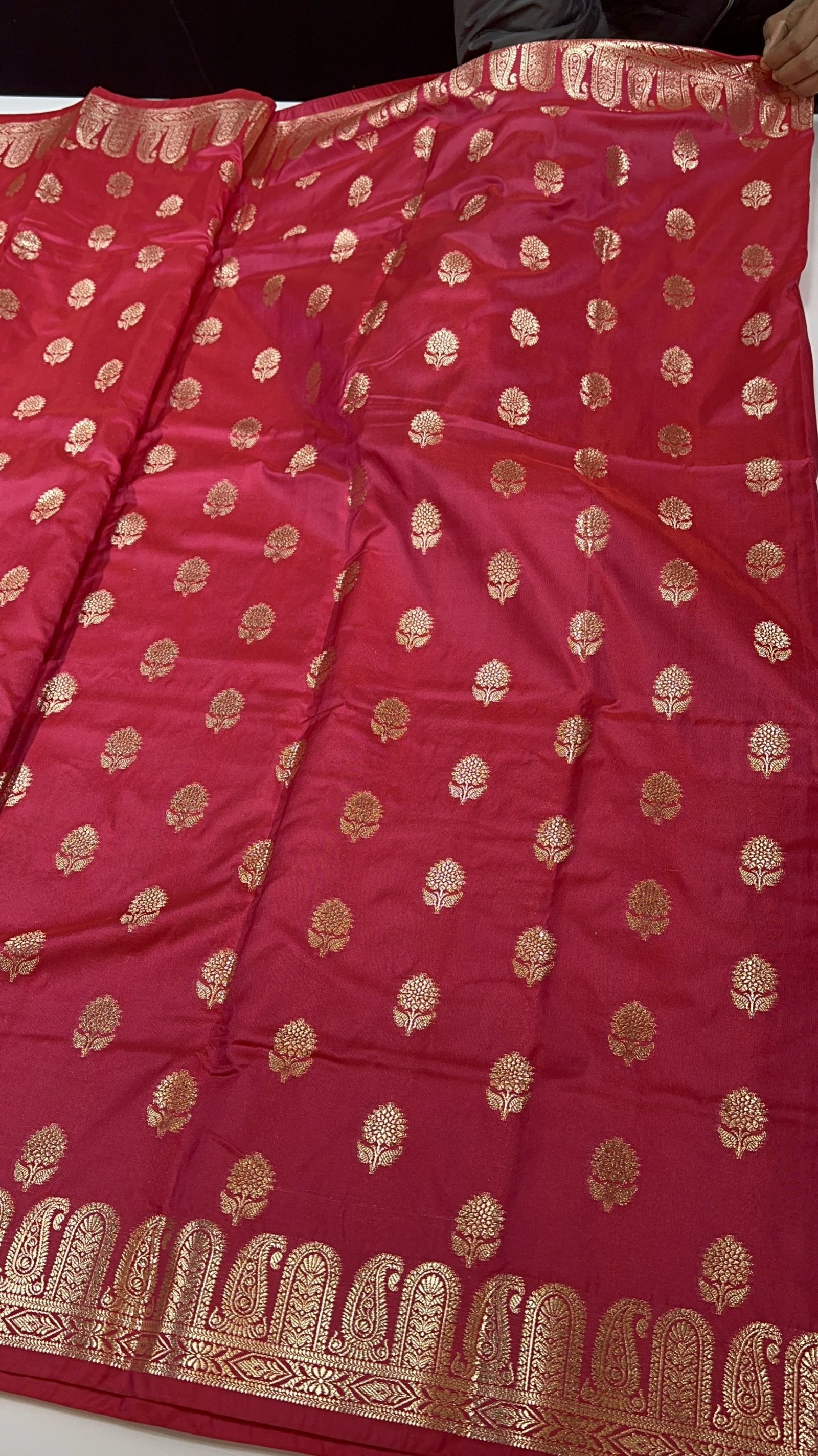 Drape yourself in timeless elegance with this soft Banarasi semi-Katan silk saree, crafted to reflect the richness of traditional Banarasi artistry ✨ The body of the saree is beautifully adorned with intricate zari weaving motifs spread gracefully all over, adding a subtle shimmer and royal charm with every movement. The fine semi-katan silk texture makes it incredibly soft, lightweight, and comfortable to carry — perfect for long celebrations without compromising on style.