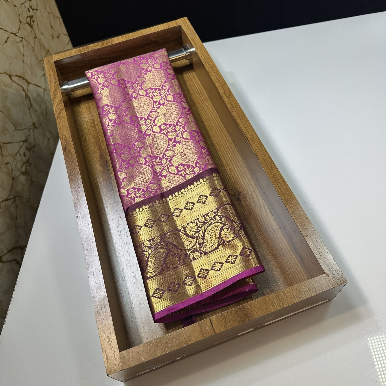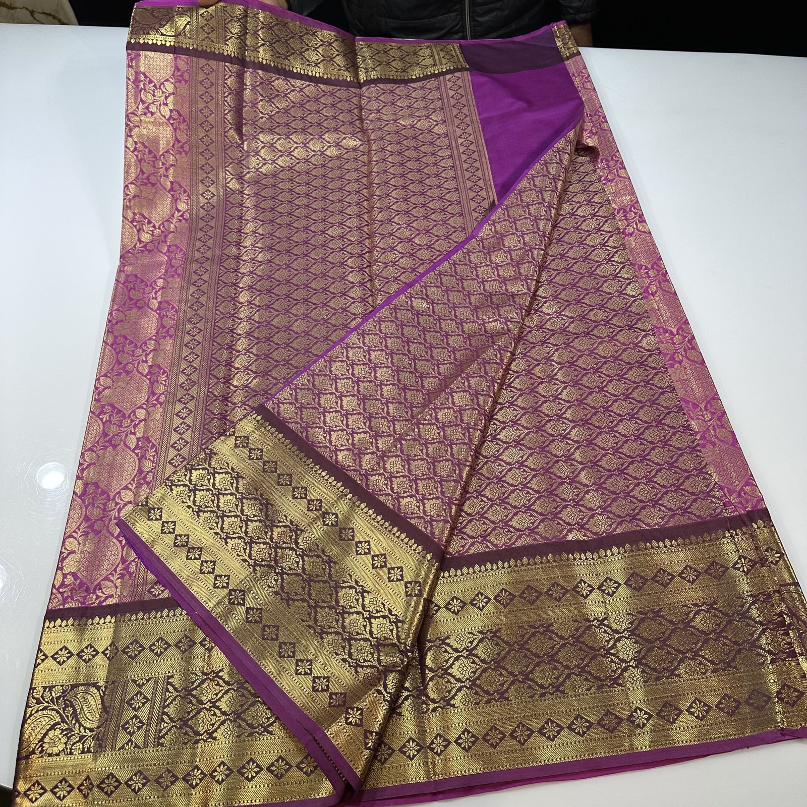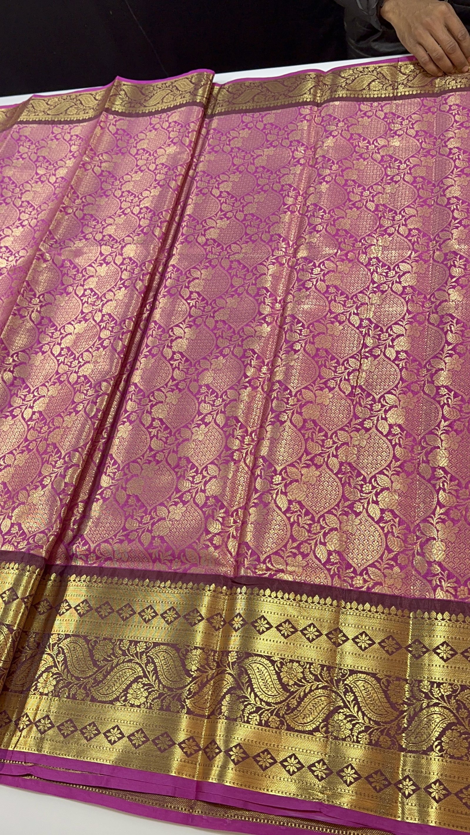 The highlight of this masterpiece is its contrast kanchi weave border, meticulously designed to add depth and definition to the drape. The striking border enhances the saree’s overall appeal, creating a perfect balance between classic Banarasi charm and South Indian kanchi aesthetics.
