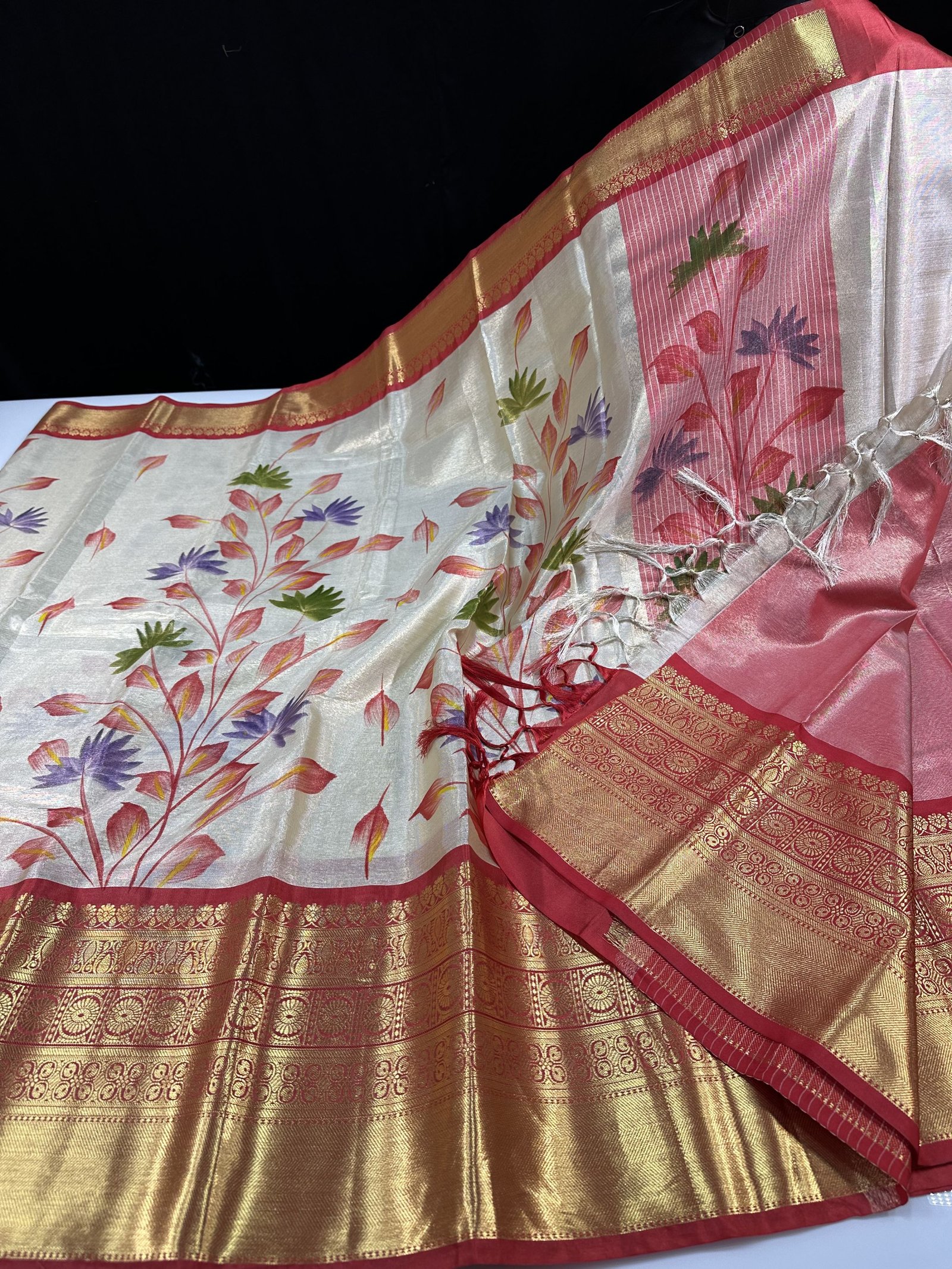 A soft and lightweight Banarasi tissue silk saree featuring an elegant hand-painted jaal pattern flowing across the body. The delicate artwork is beautifully complemented by a contrast border inspired by classic Kanchi designs, adding a refined traditional touch. Easy to drape and graceful in appeal, this saree is perfect for effortless elegance with artistic charm.