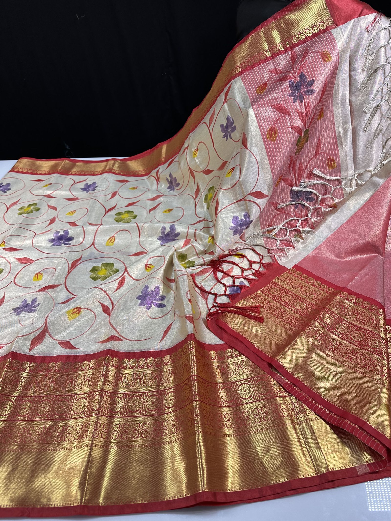 A soft and lightweight Banarasi tissue silk saree featuring an elegant hand-painted jaal pattern flowing across the body. The delicate artwork is beautifully complemented by a contrast border inspired by classic Kanchi designs, adding a refined traditional touch. Easy to drape and graceful in appeal, this saree is perfect for effortless elegance with artistic charm.