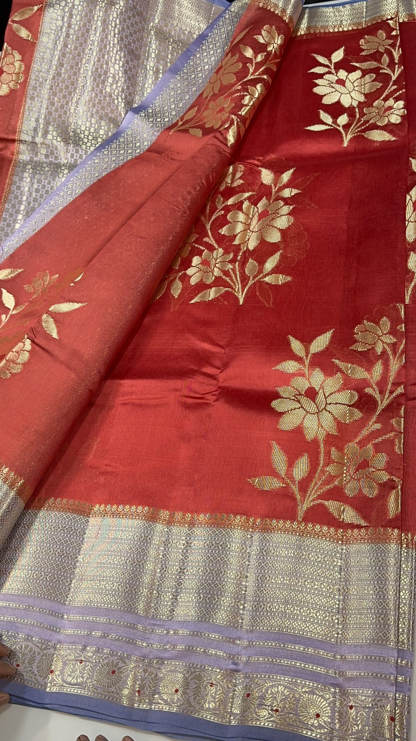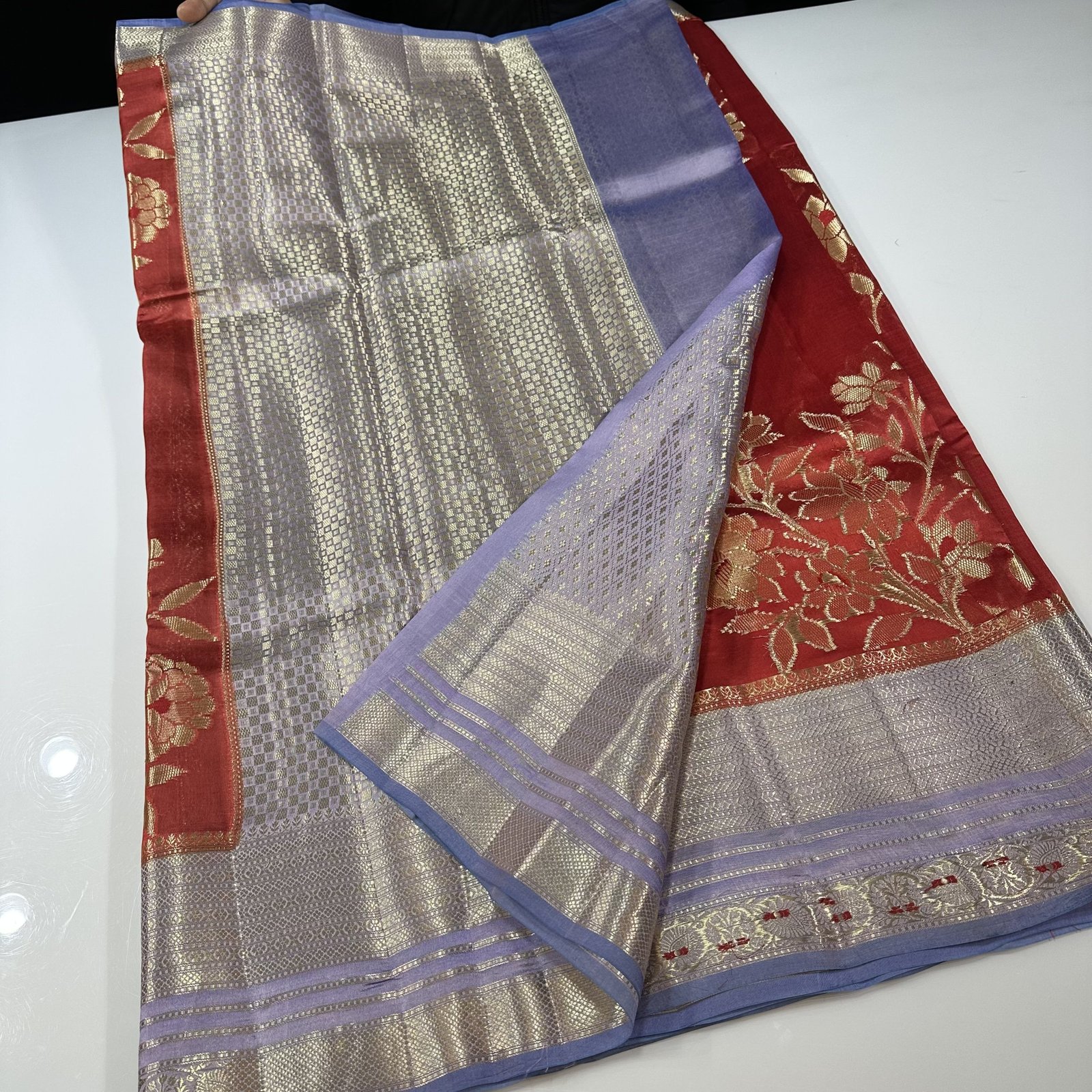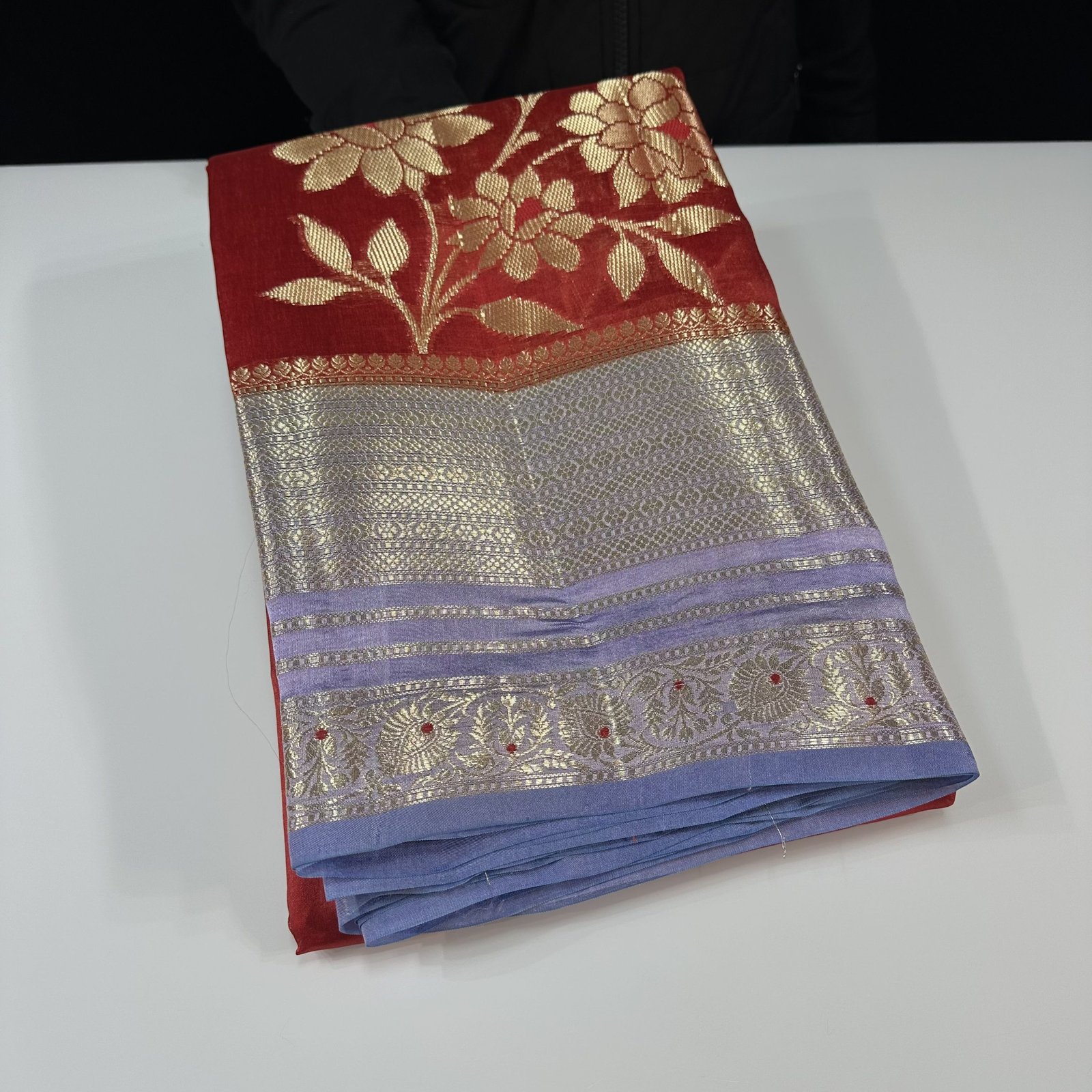 A stunning Banarasi green mango silk saree featuring intricate zari-woven buta with delicate Meena work highlights. Finished with a rich contrast weaving border and classic zari border, this saree beautifully blends vibrant color, traditional artistry, and timeless elegance—perfect for festive and special occasions.