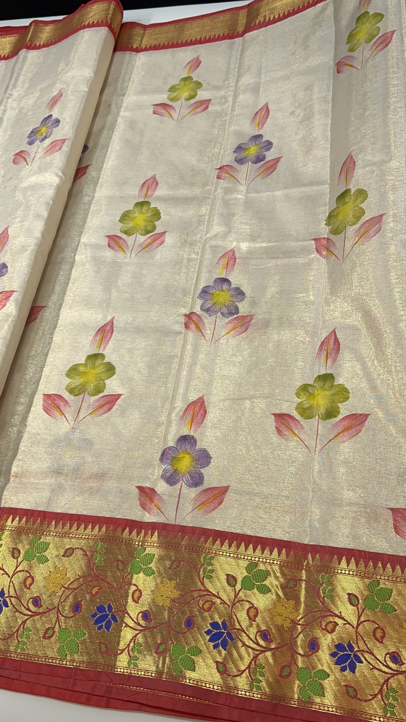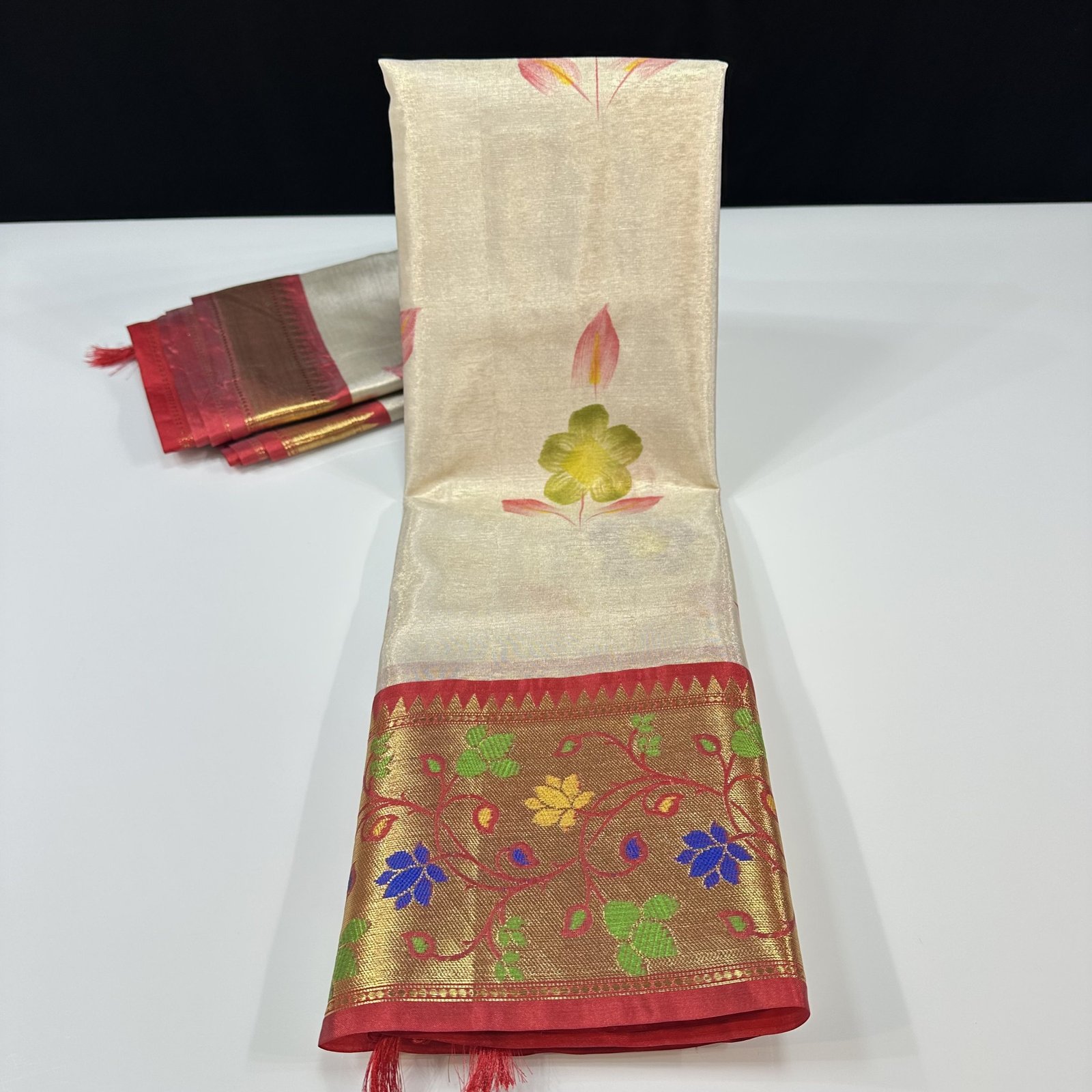 A soft Banarasi tissue silk saree in an elegant ivory shade, beautifully highlighted with hand-painted floral boota work across the body. The look is enhanced by a contrast border featuring intricate Pathani weaving, adding a refined traditional touch. Light, graceful, and easy to drape, this saree is perfect for festive occasions and timeless celebrations.