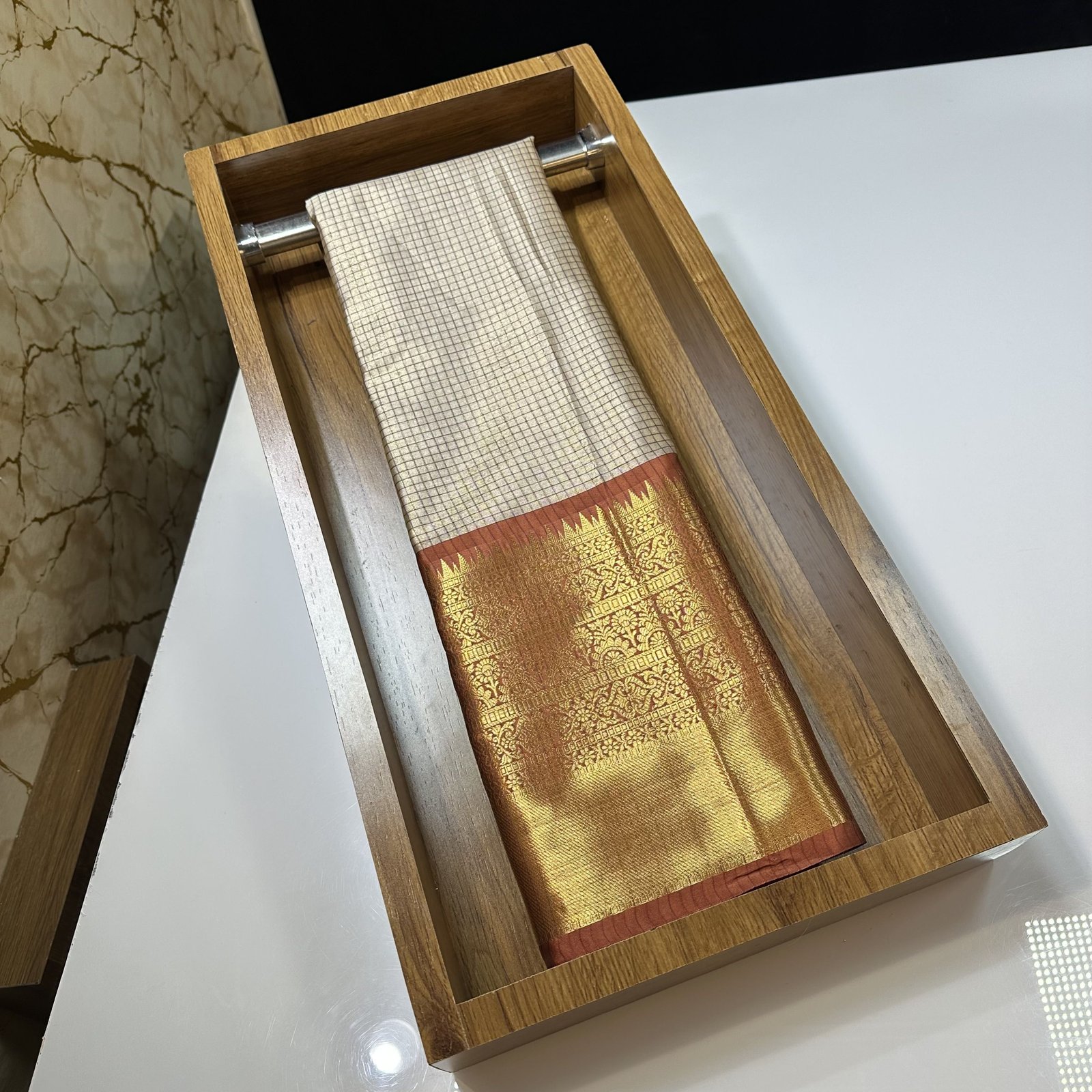 Experience sheer elegance with this Banarasi Tissue Silk Saree, gracefully adorned with resham-woven checks spread evenly across the body. The luminous tissue silk fabric lends a soft, airy texture with a subtle metallic sheen, creating a refined and graceful drape that feels as luxurious as it looks.