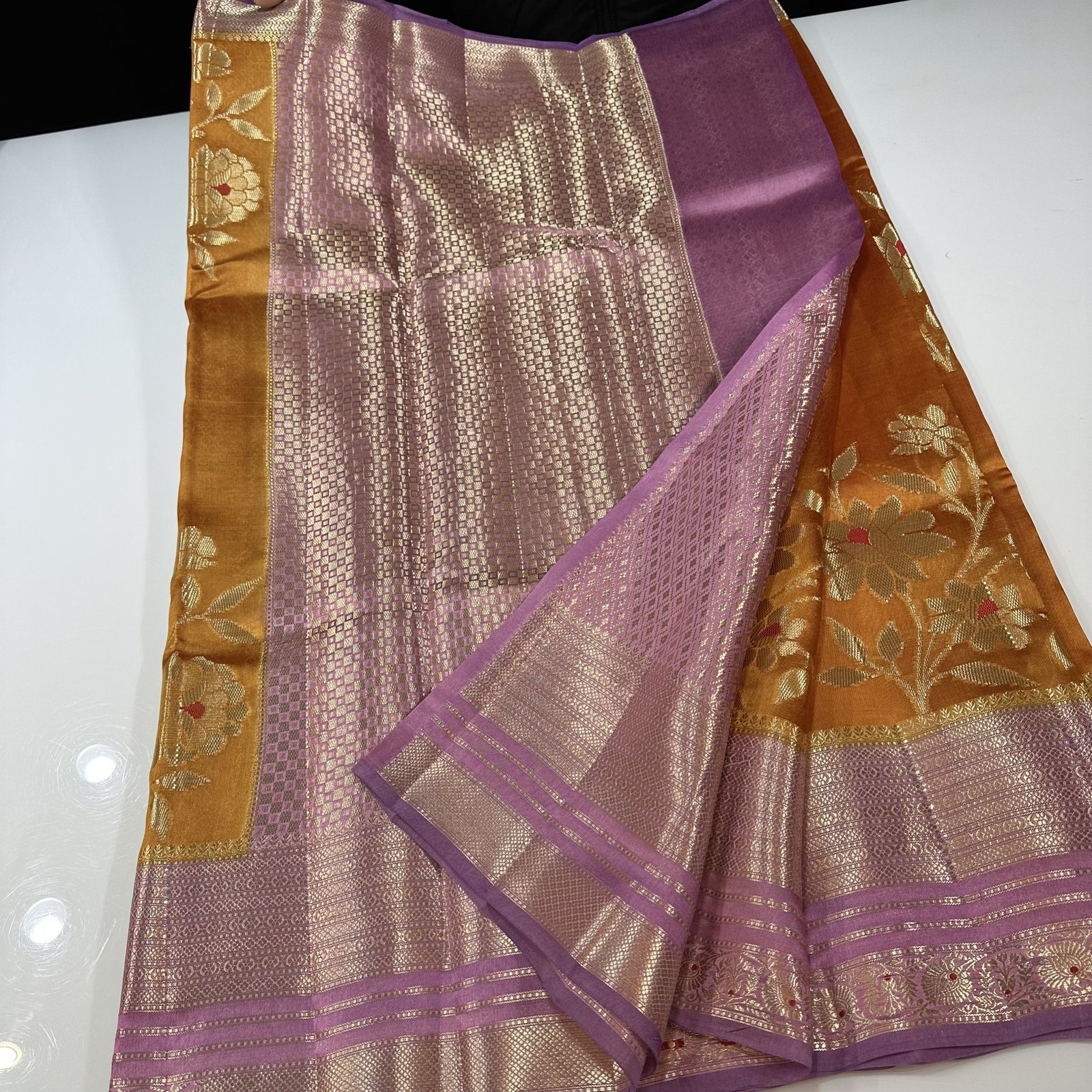 A stunning Banarasi green mango silk saree featuring intricate zari-woven buta with delicate Meena work highlights. Finished with a rich contrast weaving border and classic zari border, this saree beautifully blends vibrant color, traditional artistry, and timeless elegance—perfect for festive and special occasions.