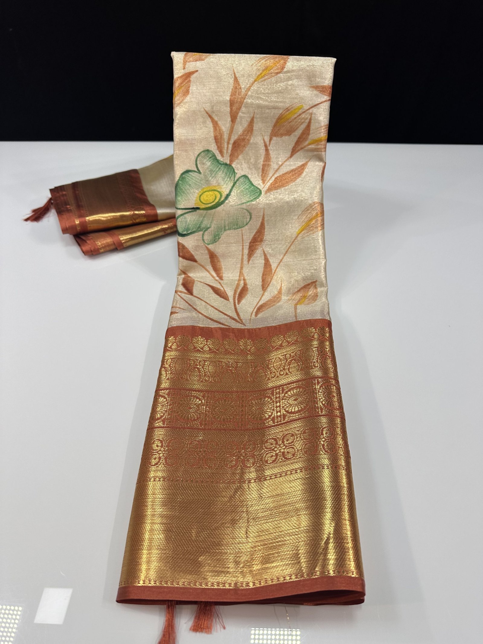 A soft and lightweight Banarasi tissue silk saree featuring an elegant hand-painted jaal pattern flowing across the body. The delicate artwork is beautifully complemented by a contrast border inspired by classic Kanchi designs, adding a refined traditional touch. Easy to drape and graceful in appeal, this saree is perfect for effortless elegance with artistic charm.