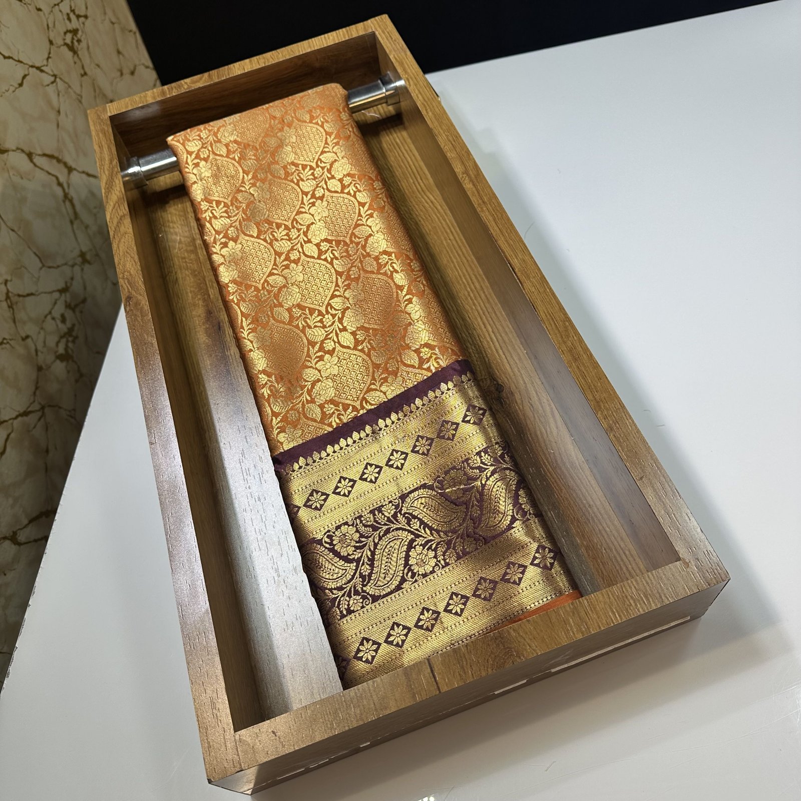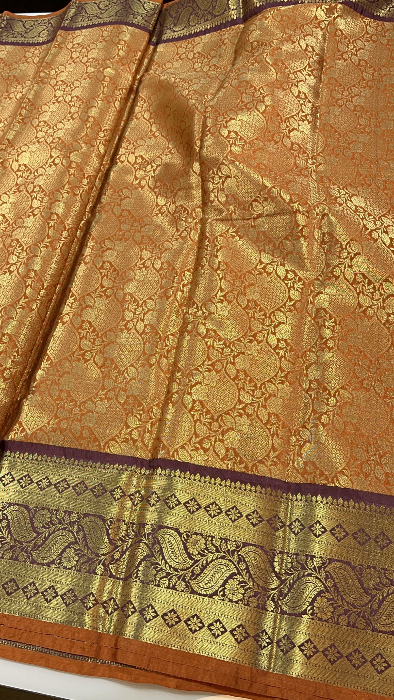 Drape yourself in timeless elegance with this Soft Banarasi Semi-Silk Brocade Saree, beautifully crafted in a Kanchi -inspired pattern. The saree showcases an exquisitely woven brocade body, where intricate motifs reflect the richness of traditional artistry while maintaining a soft, graceful fall. The highlight of this masterpiece is its contrast Kanchi weave border, meticulously designed to add depth and definition to the drape. The striking border enhances the saree’s overall appeal, creating a perfect balance between classic Banarasi charm and South Indian kanchi aesthetics.