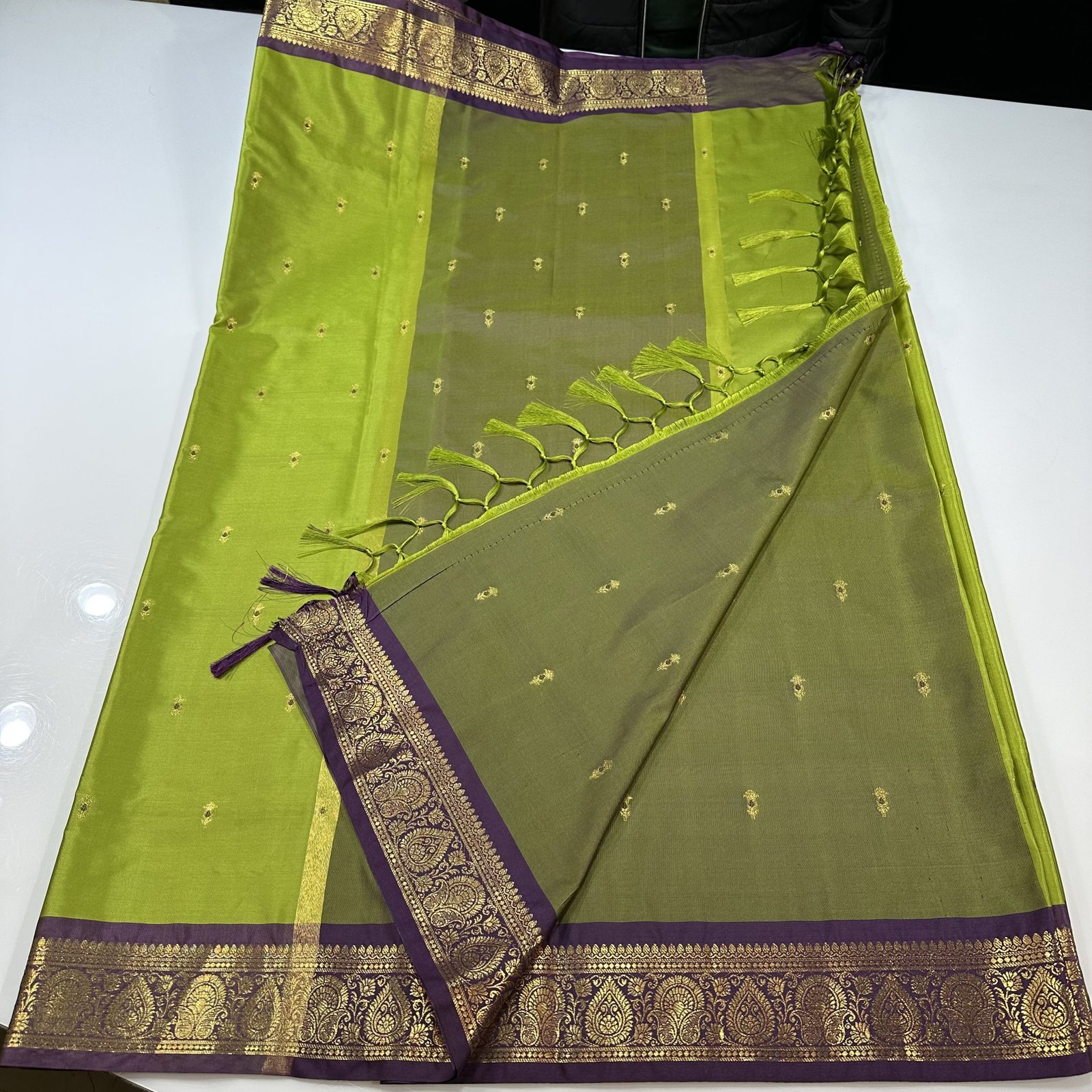 This soft Banarasi semi-silk saree is a beautiful blend of comfort and tradition, crafted with an exceptionally smooth and lightweight texture that drapes effortlessly. The body of the saree is adorned with delicate traditional zari-woven booties, each booti enriched with fine Meena work done in resham, adding subtle color highlights that bring the design to life. The interplay of shimmering zari and soft resham Meena creates a graceful, timeless charm across the saree.