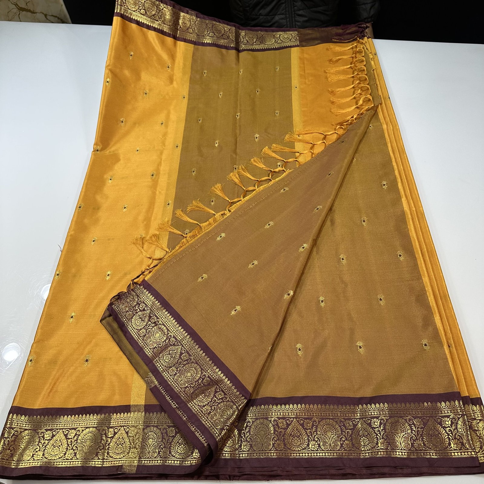 This soft Banarasi semi-silk saree is a beautiful blend of comfort and tradition, crafted with an exceptionally smooth and lightweight texture that drapes effortlessly. The body of the saree is adorned with delicate traditional zari-woven booties, each booti enriched with fine Meena work done in resham, adding subtle color highlights that bring the design to life. The interplay of shimmering zari and soft resham Meena creates a graceful, timeless charm across the saree.