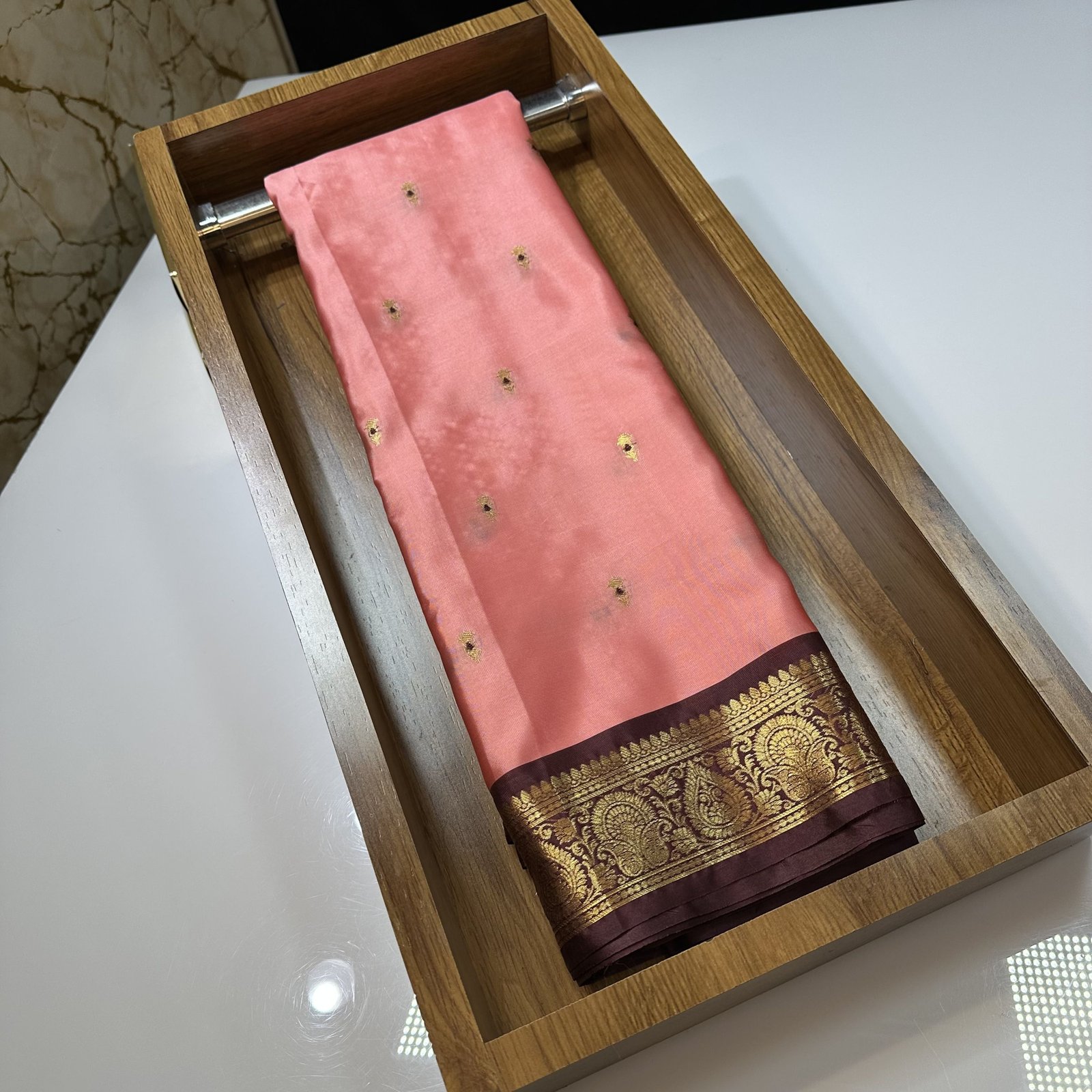 A graceful soft Banarasi semi-silk saree crafted for effortless elegance. The fabric is exceptionally soft, lightweight, and beautifully body-hugging, making it perfect for all-day comfort with a rich drape. The body is adorned with intricate zari weaving meenakari motifs that add a touch of traditional charm and subtle shimmer. Finished with a delicate small contrast weaving border, this saree comes in bright, vibrant shades that make it a stunning choice for festive and special occasions. ✨