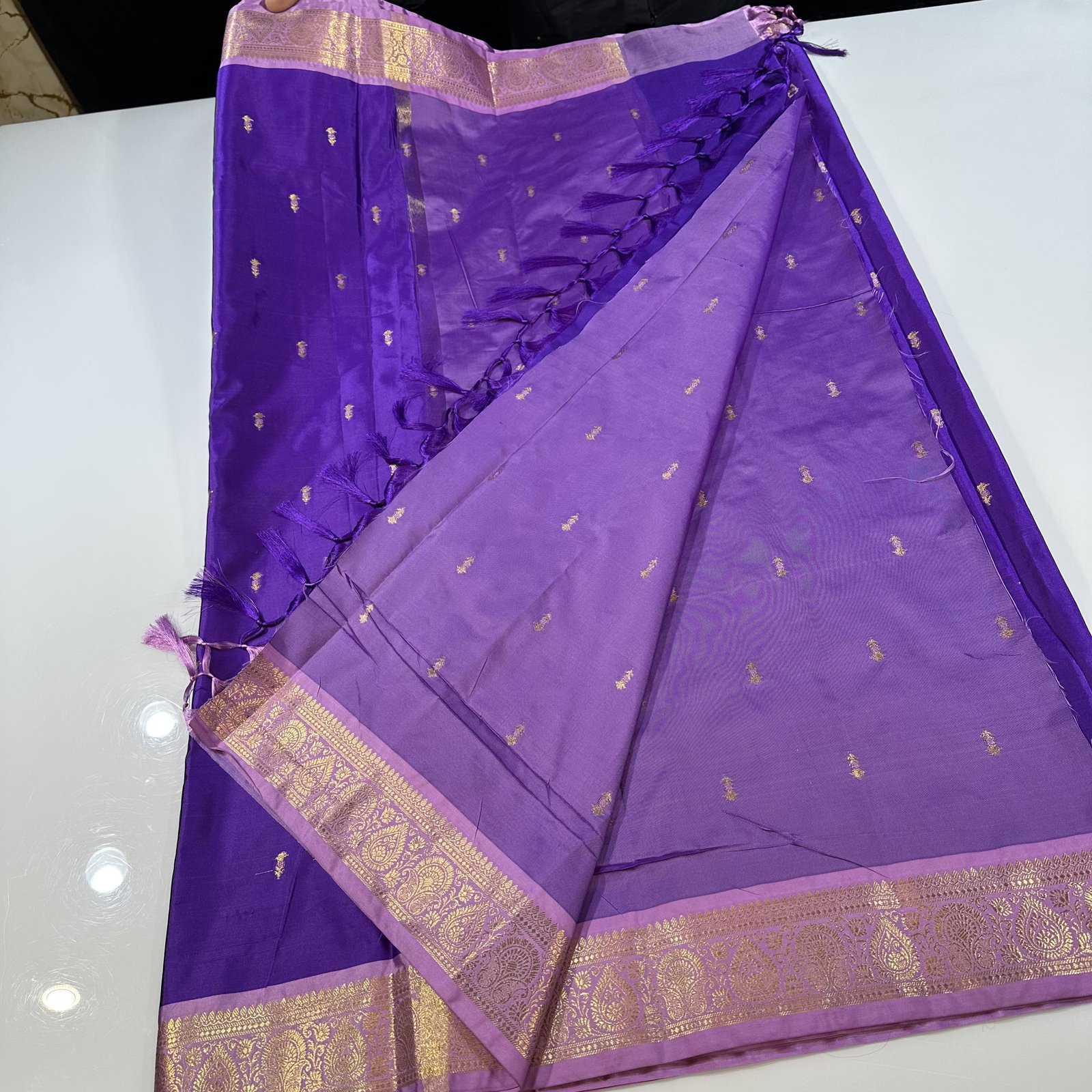A soft and ultra-lightweight Banarasi semi-silk sari crafted for effortless drape and a graceful, body-hugging fall. The rich bright violet body is adorned with delicate zari-woven Vinagari motifs, adding a subtle traditional charm. Finished with a very fine, contrast-woven border in a soothing light lavender shade, this sari blends elegance, comfort, and timeless Banarasi artistry—perfect for all-day wear with a refined look.