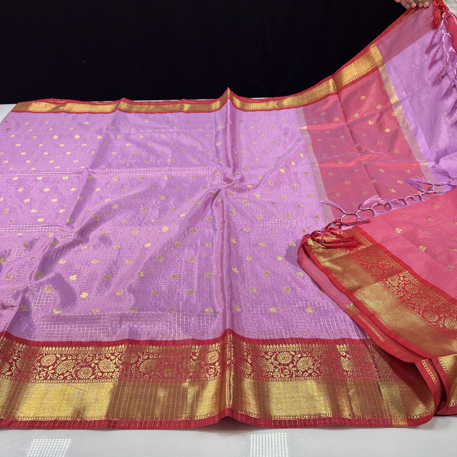 Best selling semi-Gadwal inspired checks saree in lavender shade with red shade weaving border