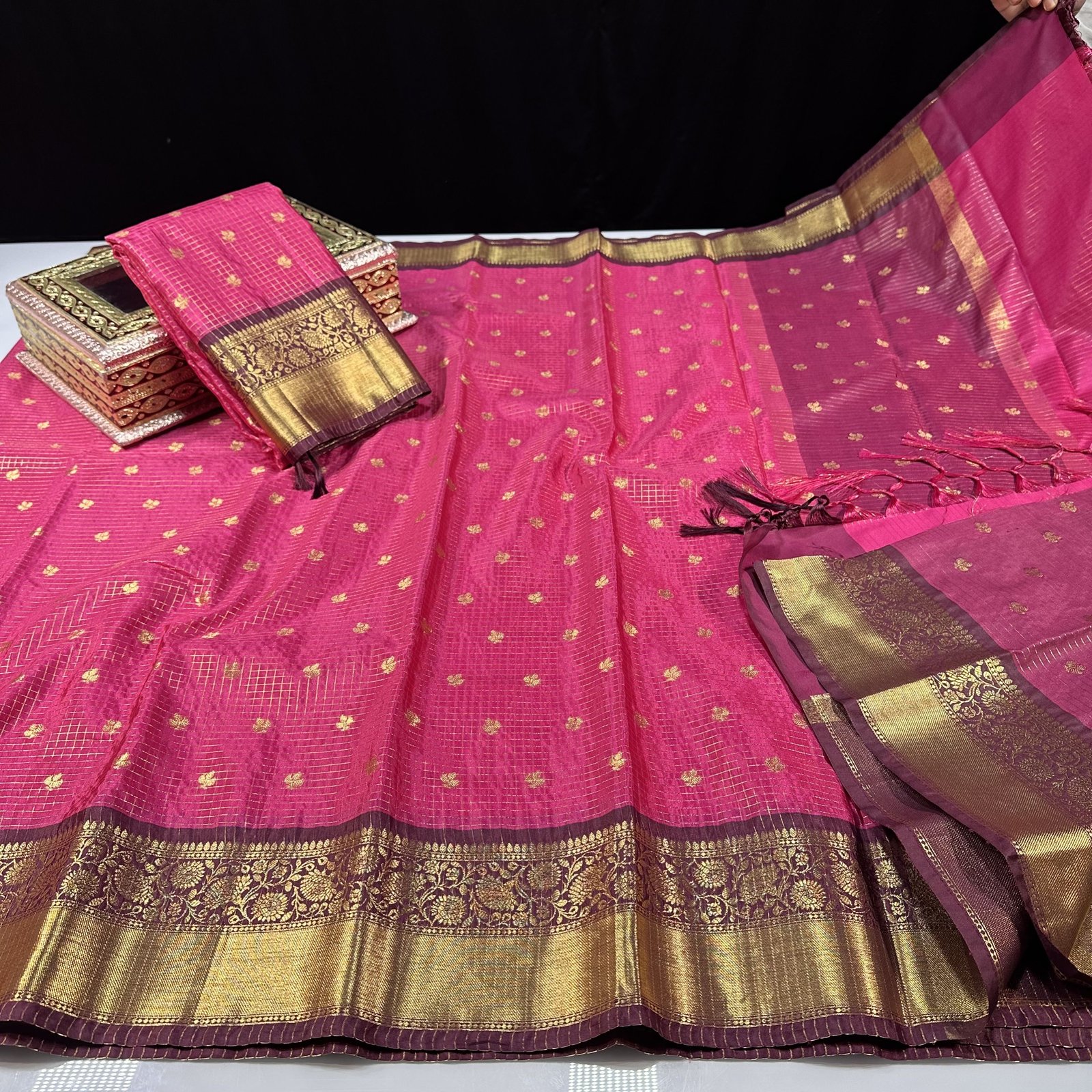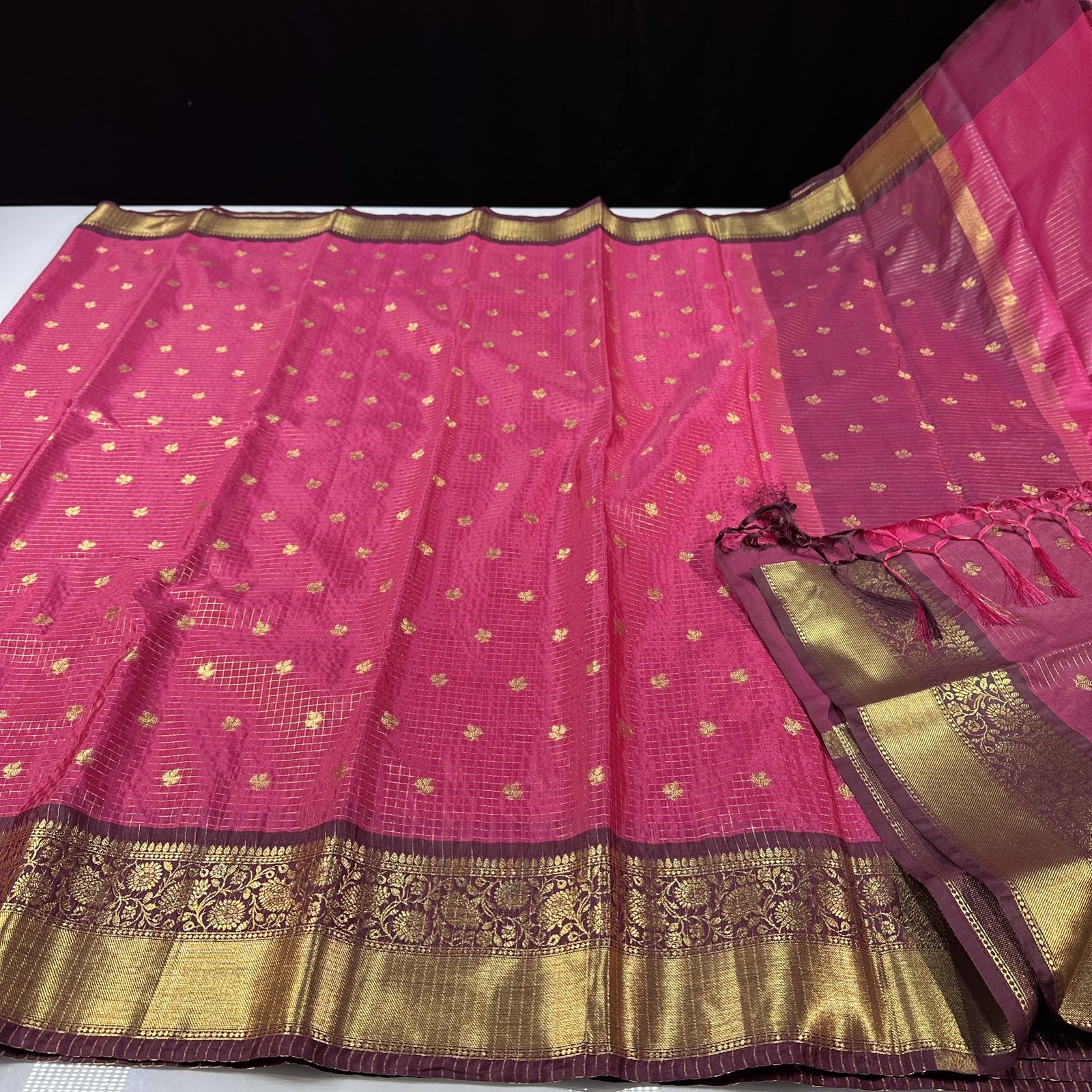 Soft semi-Gadwal checks saree in Rani shade with contrast weaving deep maroon border