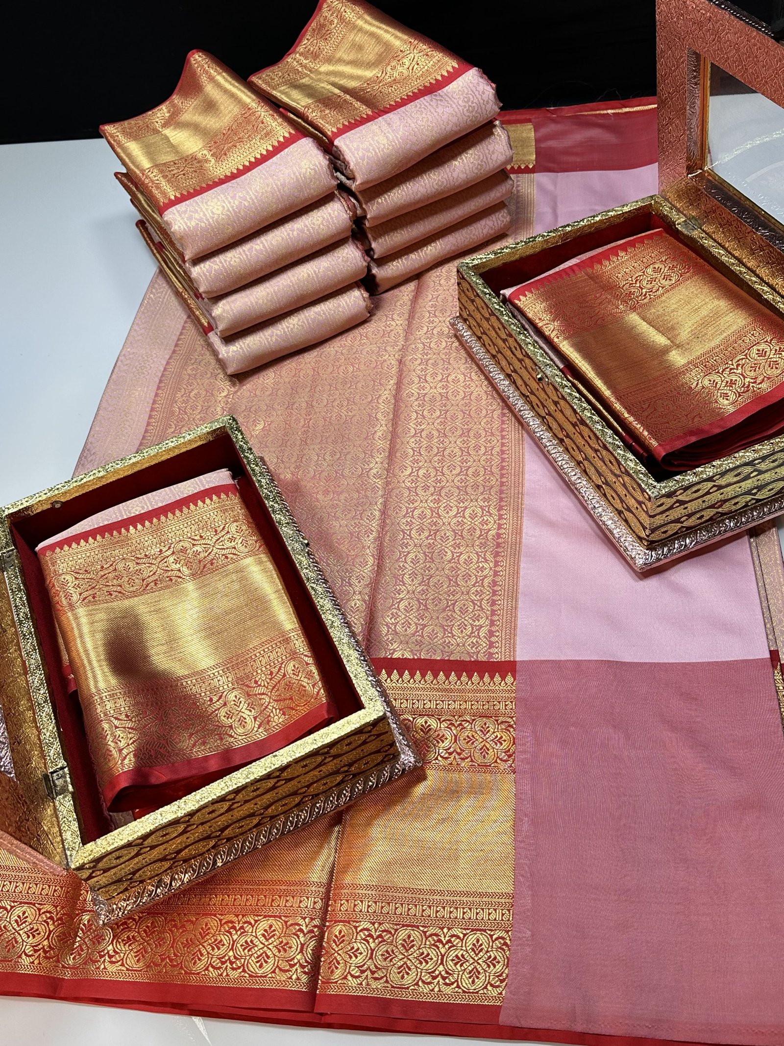 Soft semi-Kanchi brocade saree in the most trending pink-red combination