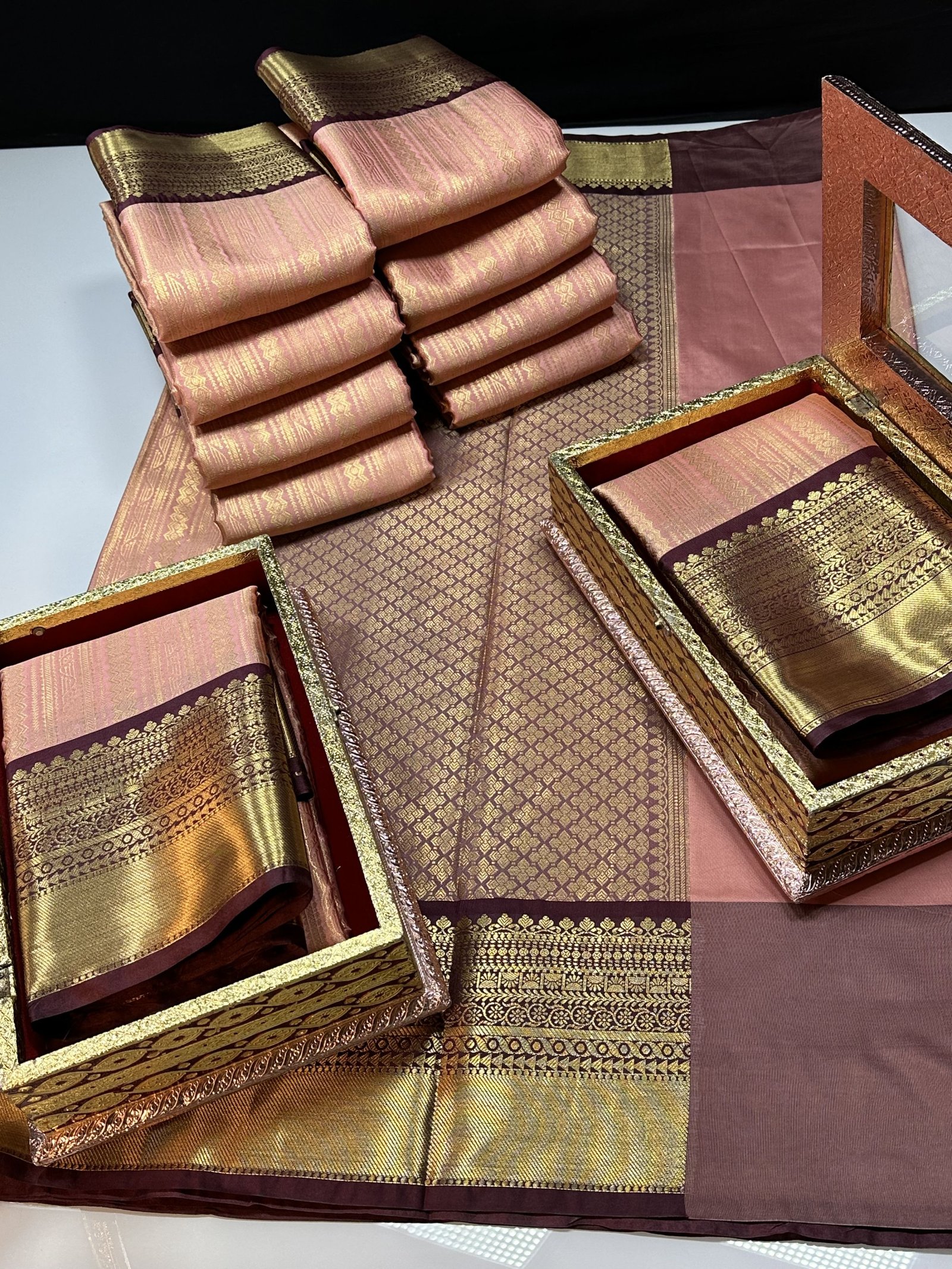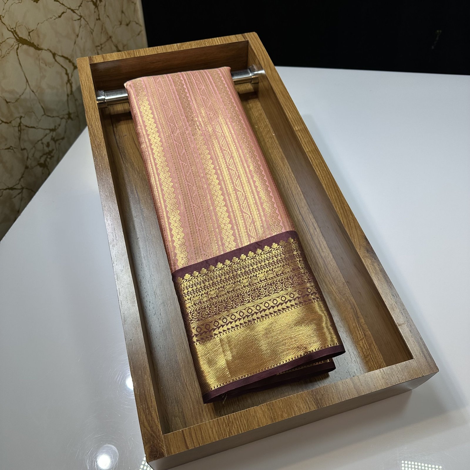 Soft semi-Kanchi brocade saree in peach shade having contrast weaving deep maroon Kanchi border