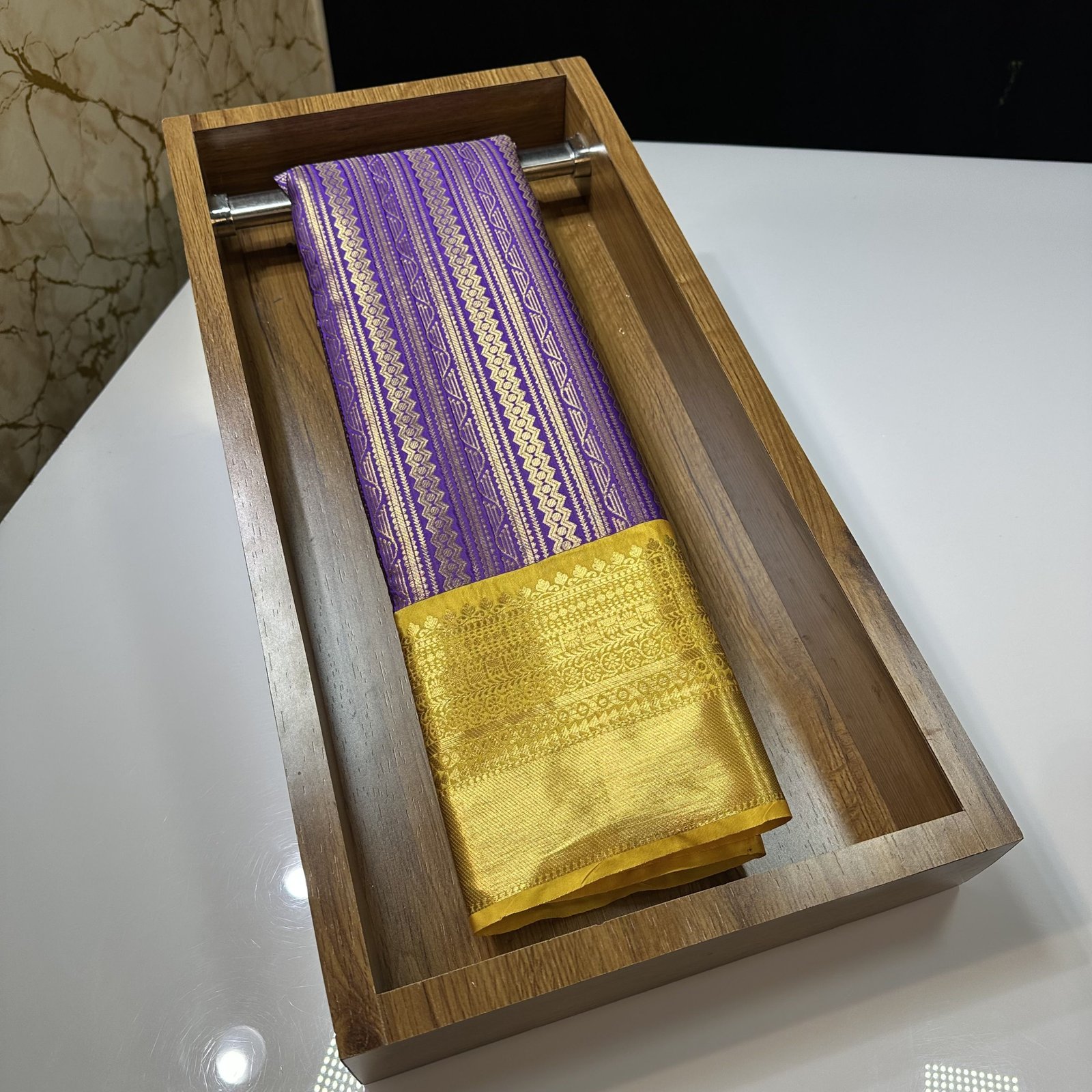 THE BEST SELLING SOFT SEMI-KANCHI BROCADE SAREE IN VIOLET SHADE WITH CONTRAST WEAVING YELLOW SHADE KANCHI BORDER