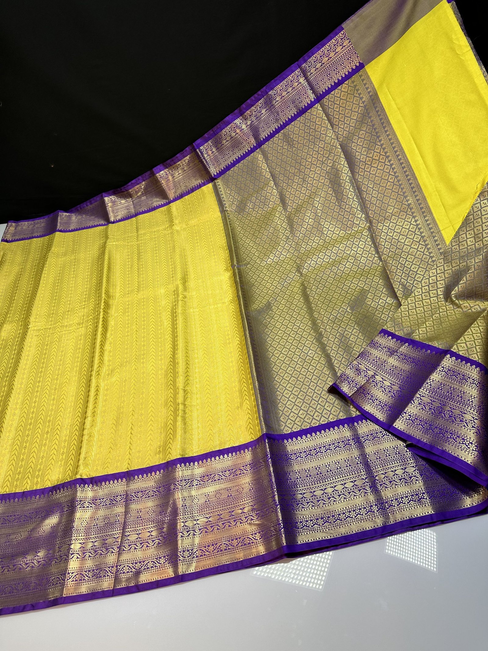 SOFT SEMI-KANCHI BROCADE SAREE IN YELLOW SHADE WITH CONTRAST WEAVING VIOLET KANCHI BORDER