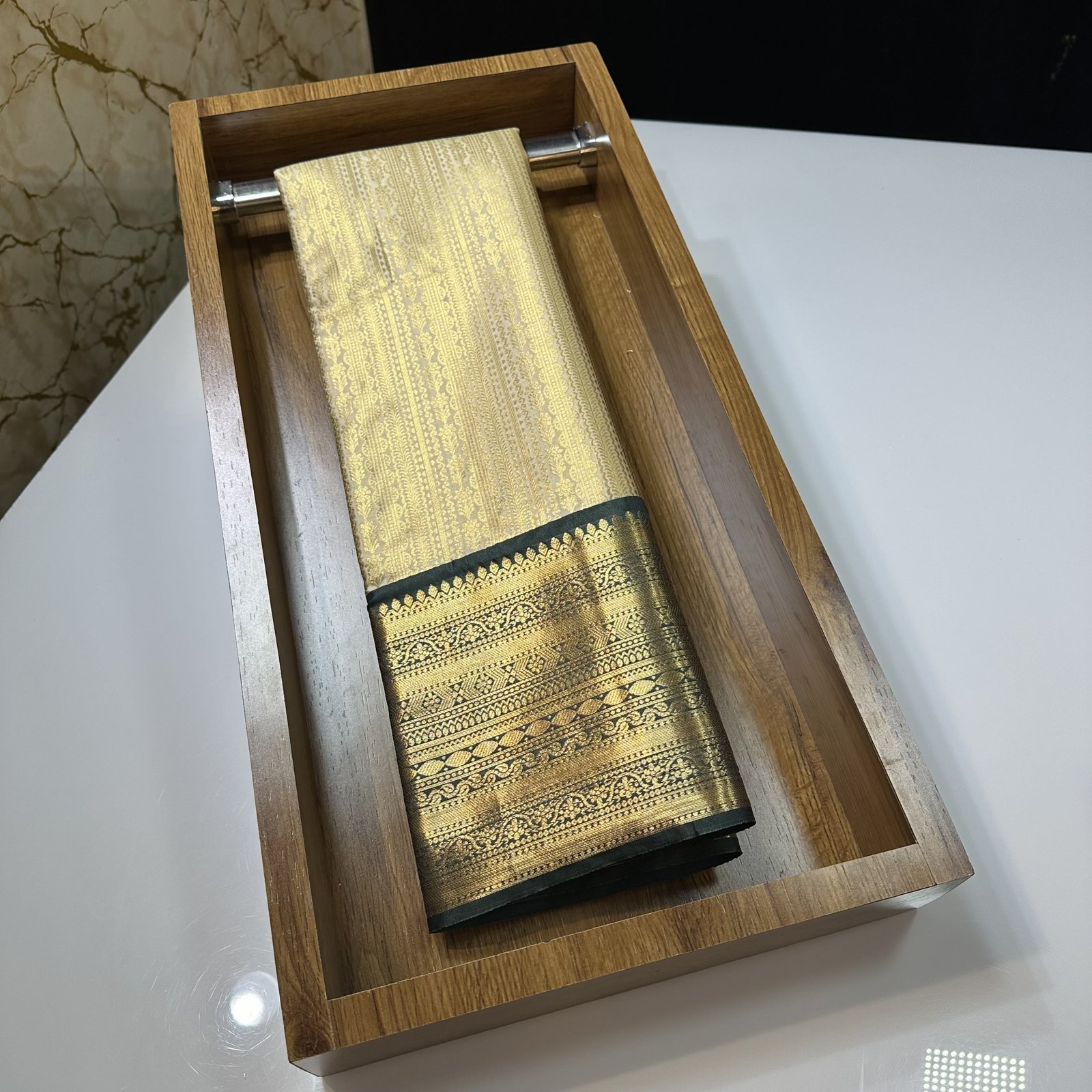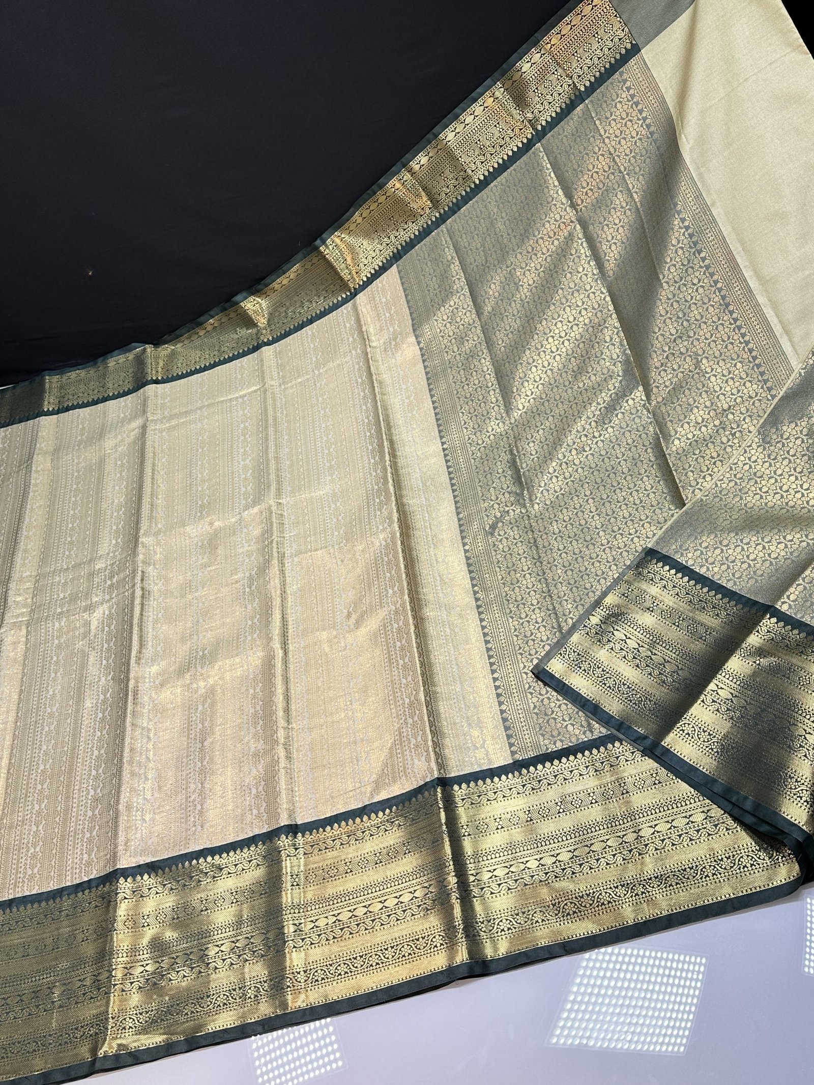 SOFT SEMI-KANCHI BROCADE SAREE IN PEARL SHADE WOTH CONTRAST WEAVING BOTTLE GREEN KANCHI BORDER