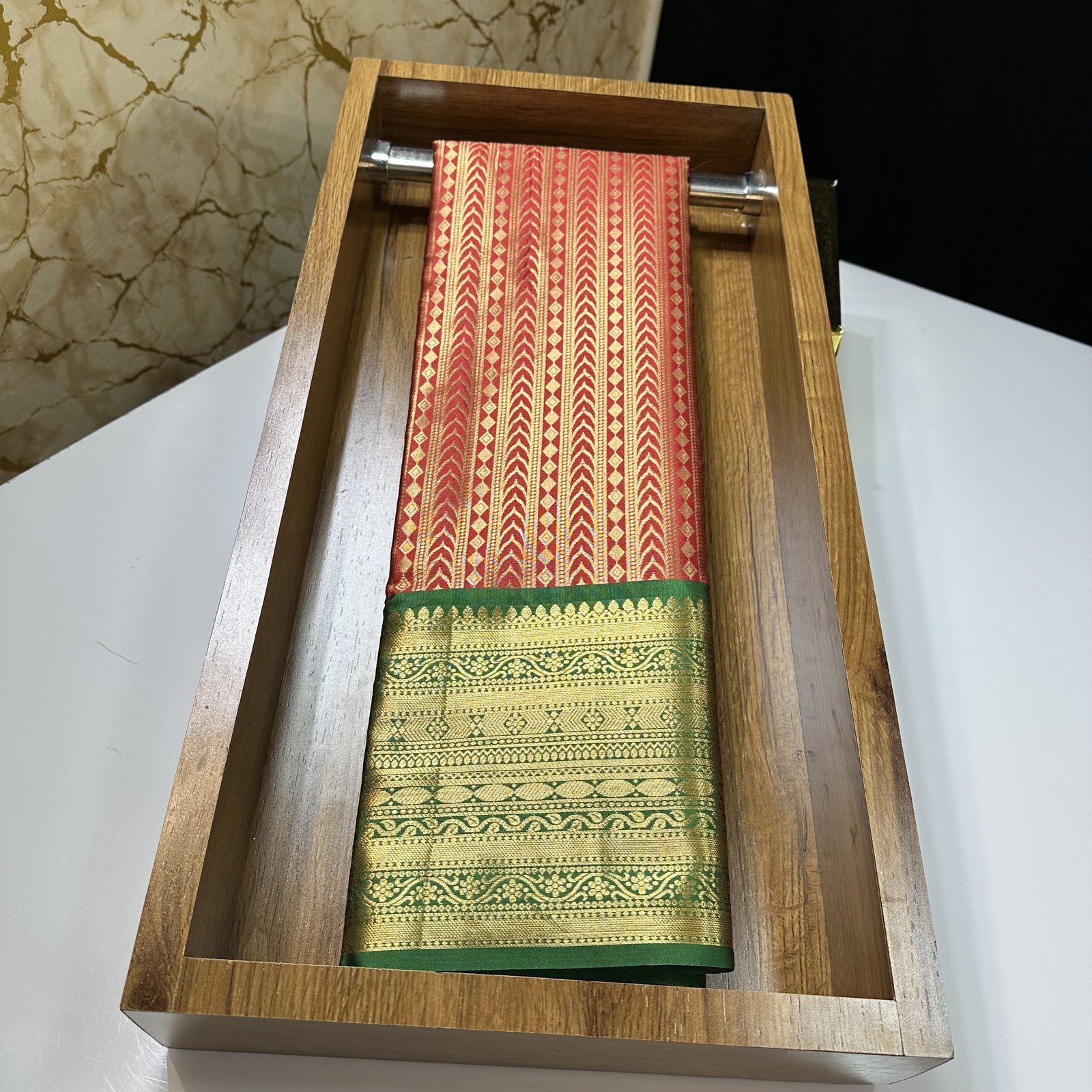 SOFT SEMI-KANCHI BROCADE SAREE IN RED SHADE WITH CONTRAST WEAVING GREEN KANCHI BORDER