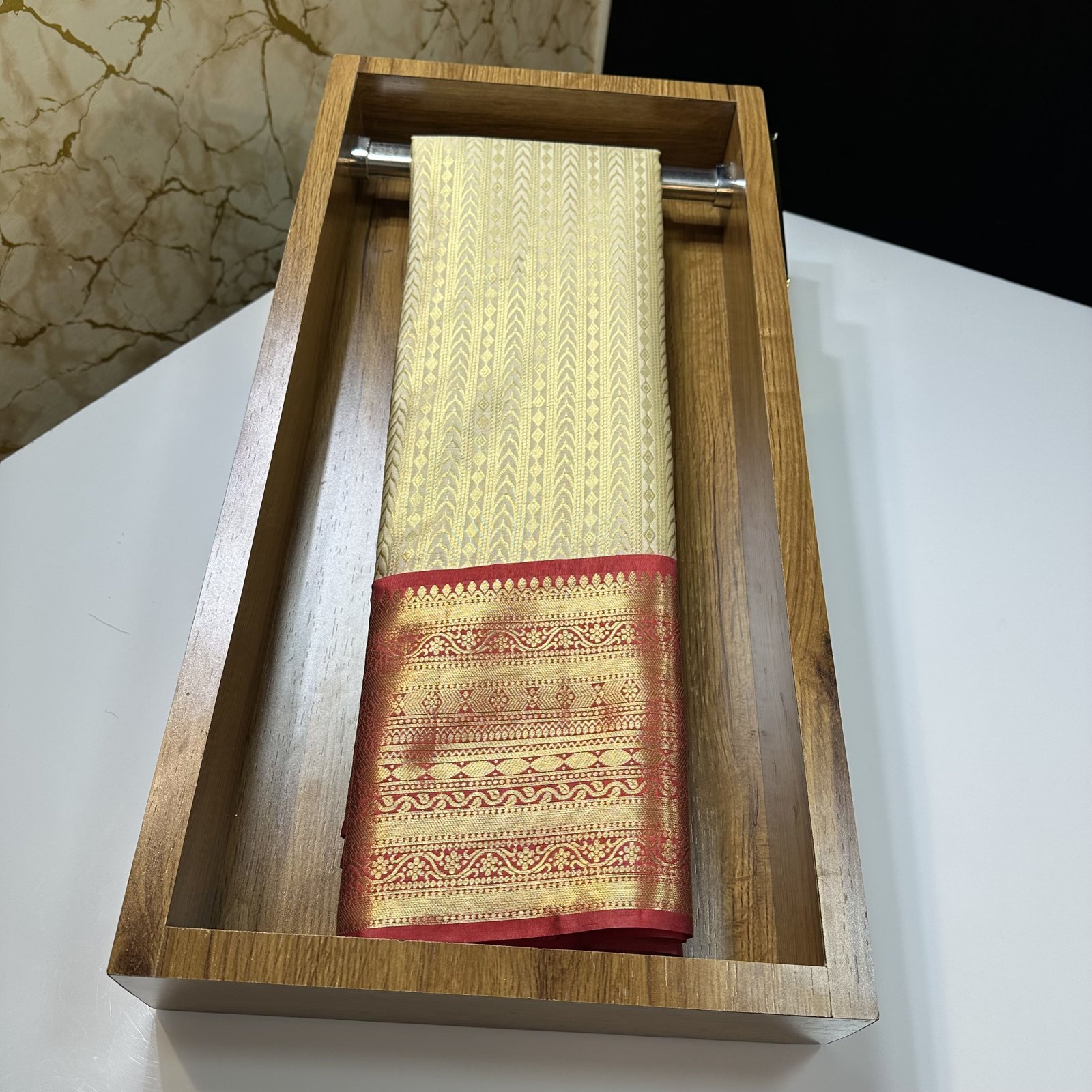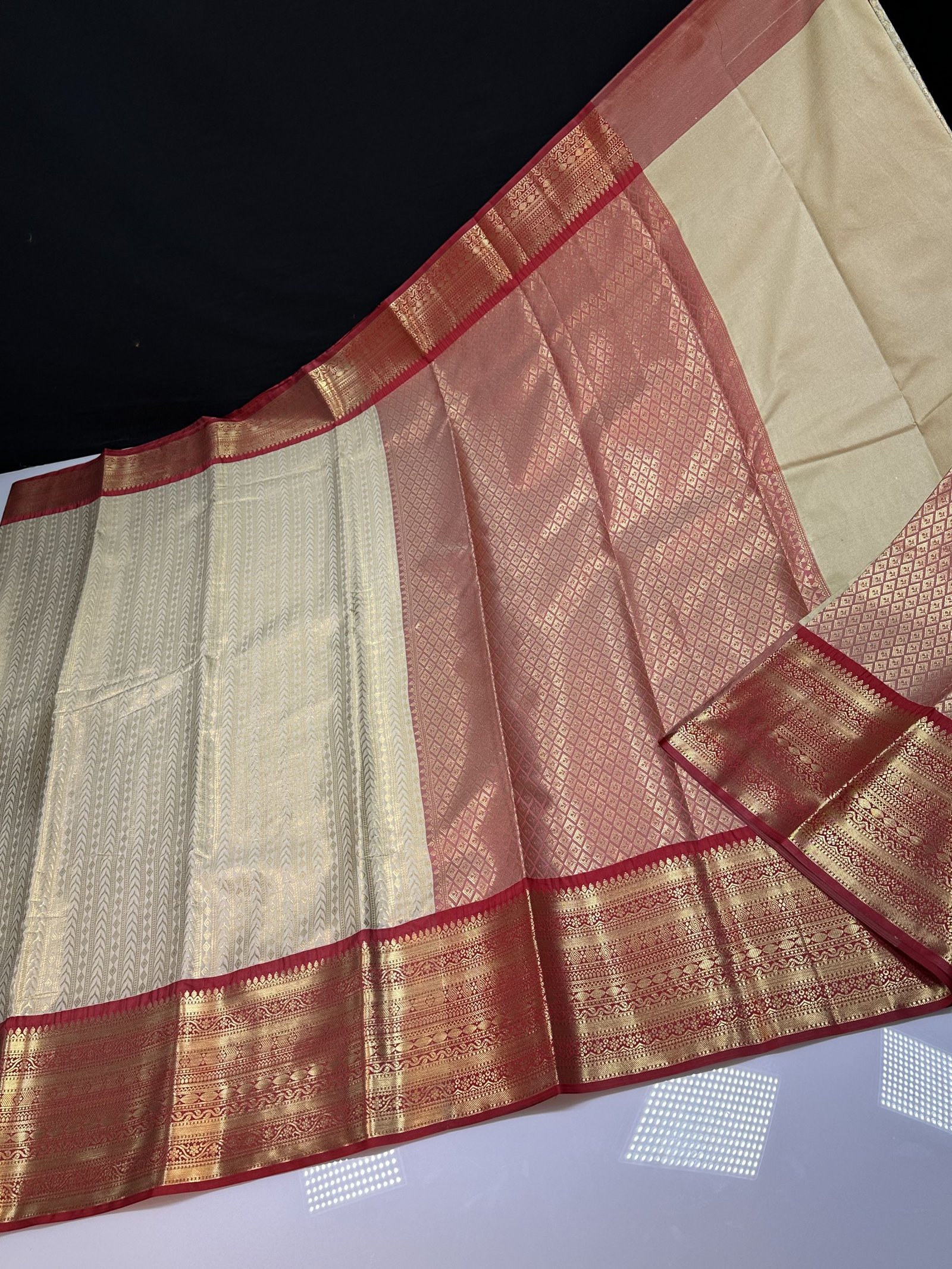 SOFT SEMI KANCHI BROCADE SAREE IN PEARL SHADE WITH CONTRAST WEAVING RED KANCHI BORDER