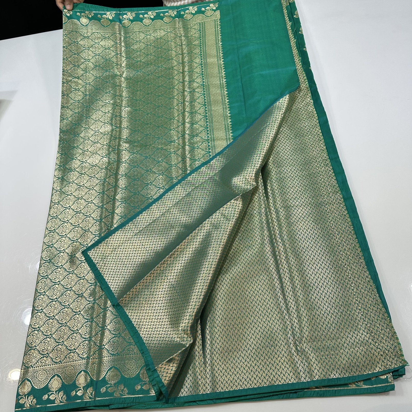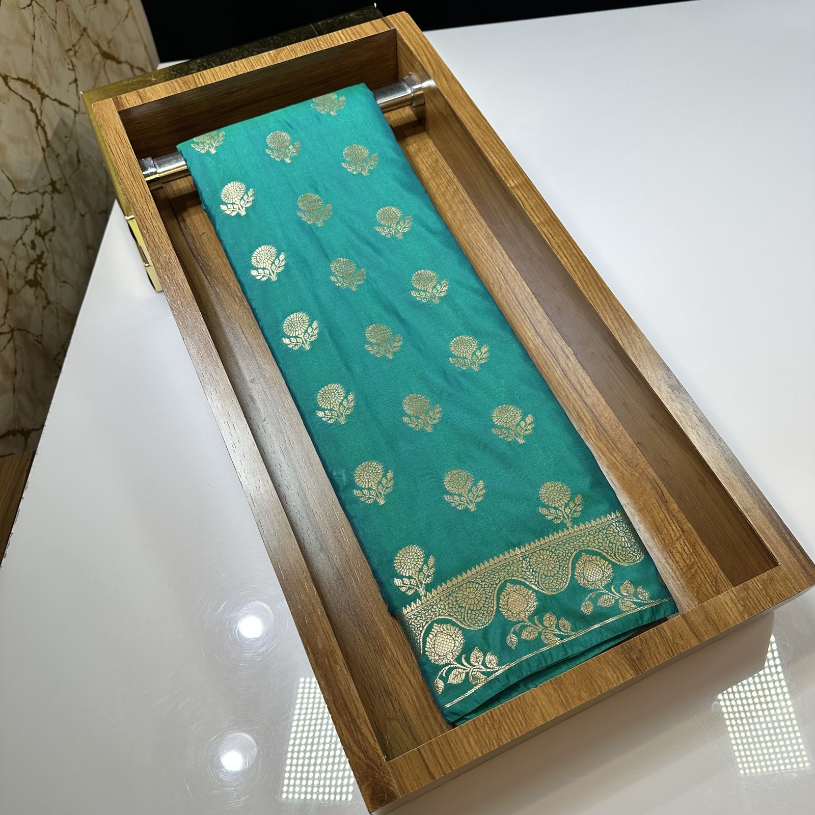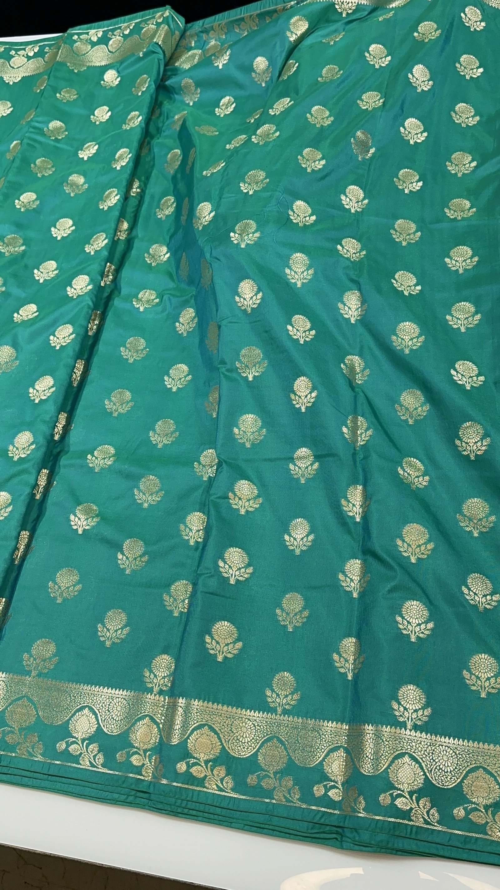 Its standout appeal lies in the rich shaded tone, reminiscent of authentic Banarasi silk color gradations, giving it a soft, luminous finish. Lightweight, smooth, and easy to drape, this saree is perfect for effortless festive styling with a touch of heritage sophistication.
