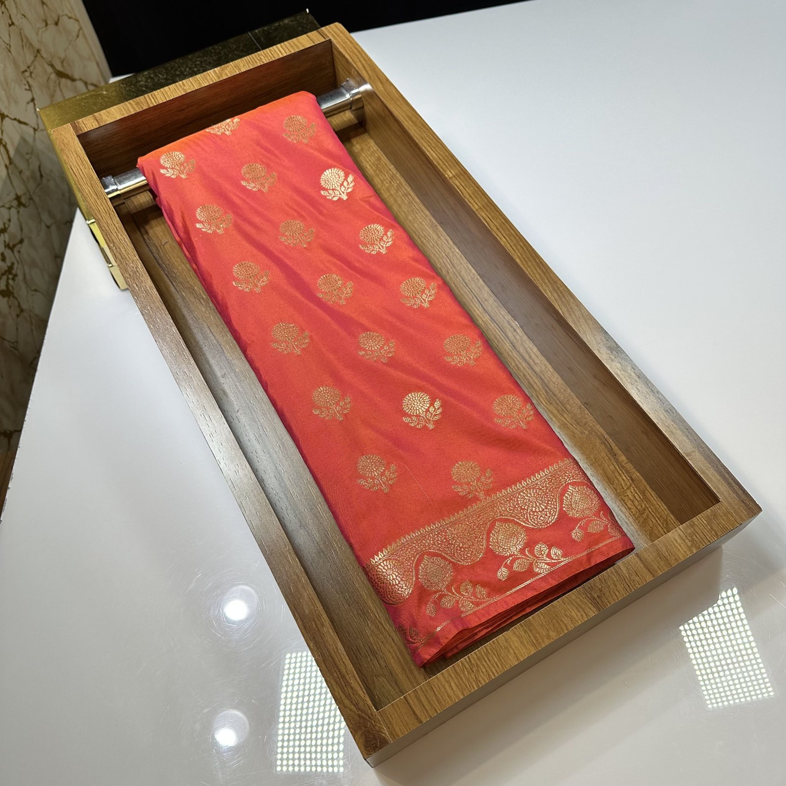 Its standout appeal lies in the rich shaded tone, reminiscent of authentic Banarasi silk color gradations, giving it a soft, luminous finish. Lightweight, smooth, and easy to drape, this saree is perfect for effortless festive styling with a touch of heritage sophistication.