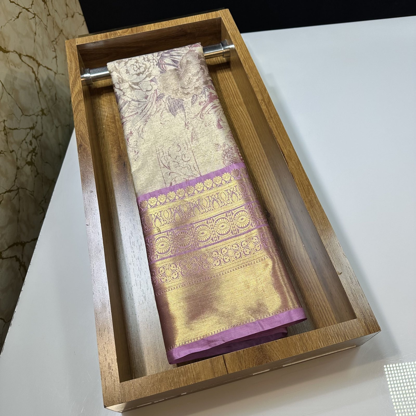 The soft Banarasi tissue silk saree with digital printed jaal allover saree having lavender shade Kanchi border