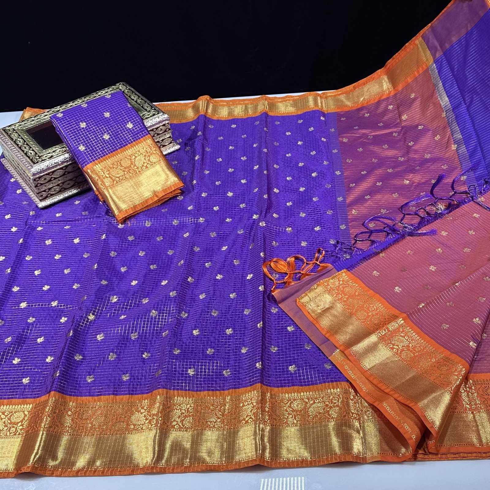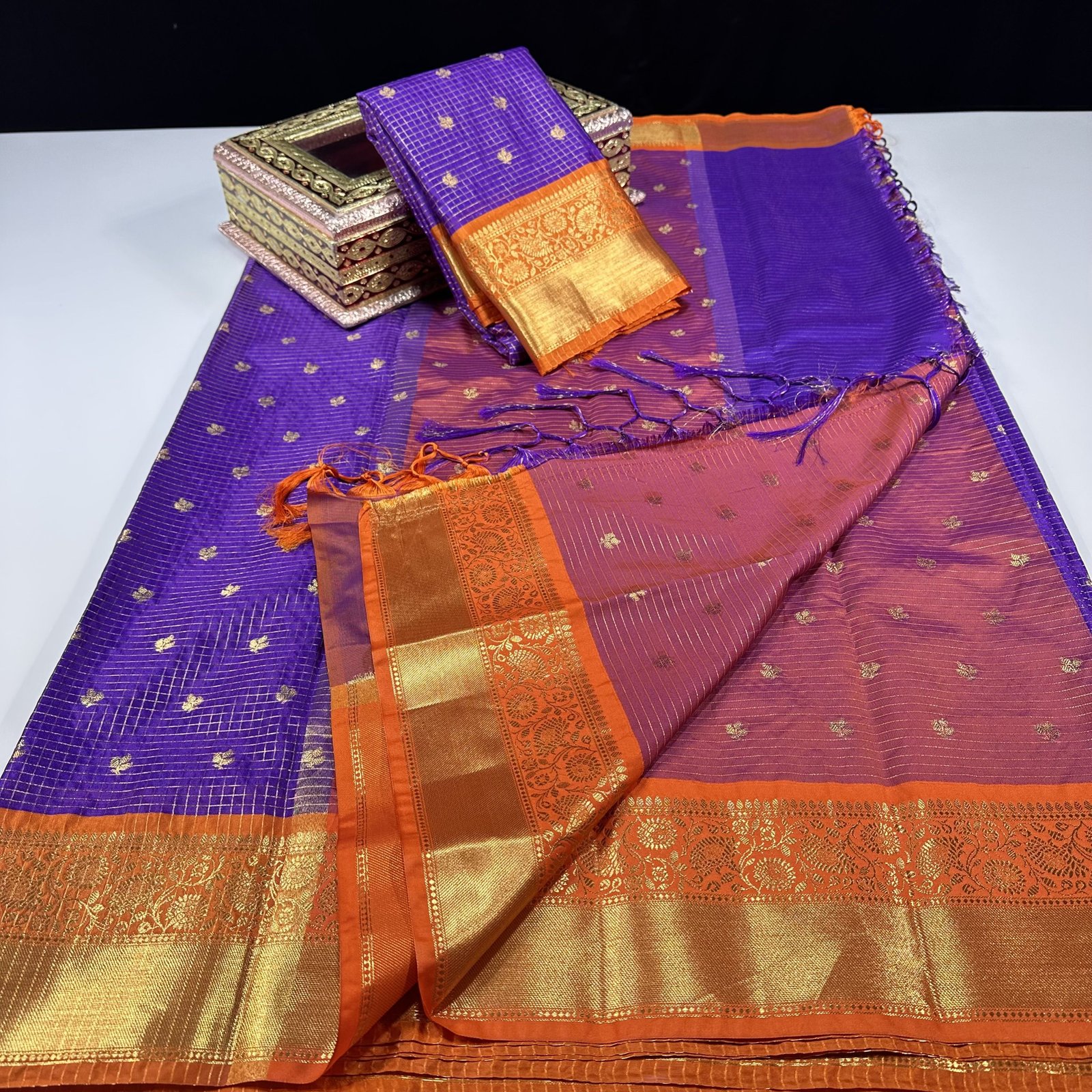 Soft semi-Gadwal checks saree in violet shade with contrast weaving Kanchi border