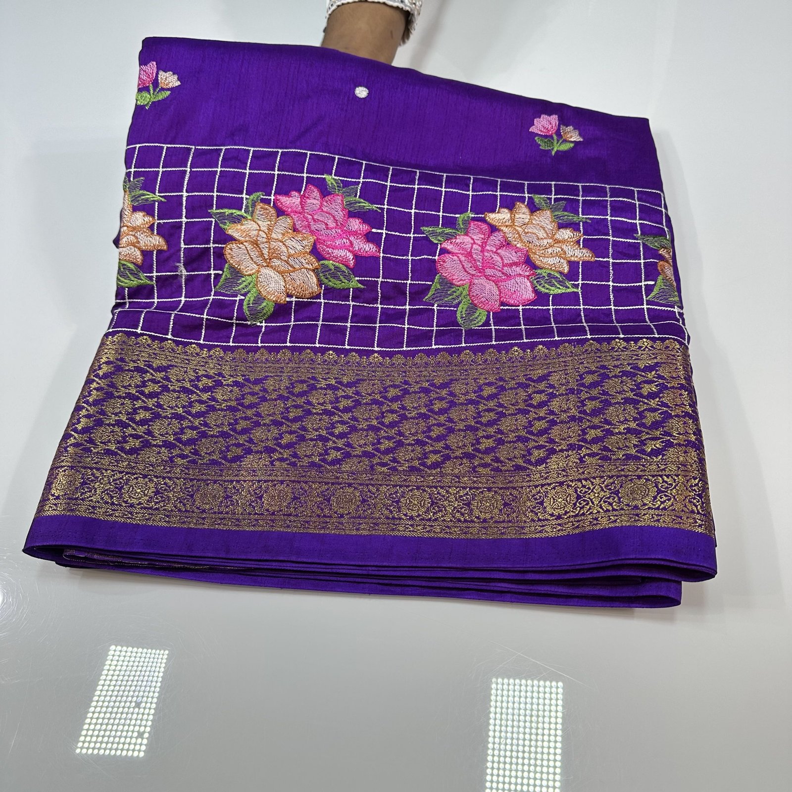 A soft dola silk saree featuring elegant embroidery work, highlighted with resham check patterns delicately crafted along a small border region. The checks are enhanced with embroidered buta motifs, adding refined detail without heaviness. Finished with a subtle zari-edged narrow border, this saree offers a graceful blend of softness, craftsmanship, and understated festive char