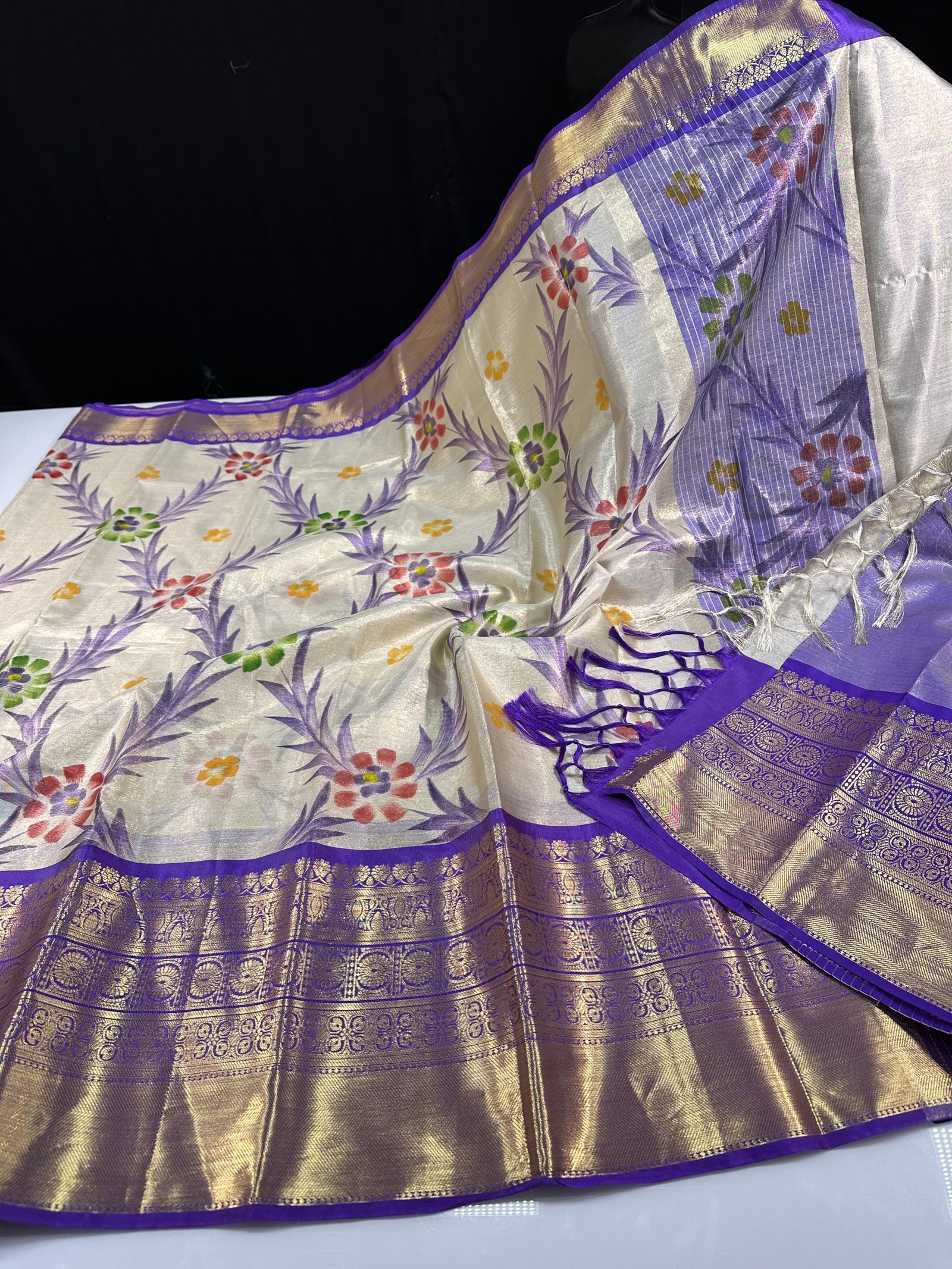 A soft and lightweight Banarasi tissue silk saree featuring an elegant hand-painted jaal pattern flowing across the body. The delicate artwork is beautifully complemented by a contrast border inspired by classic Kanchi designs, adding a refined traditional touch. Easy to drape and graceful in appeal, this saree is perfect for effortless elegance with artistic charm.