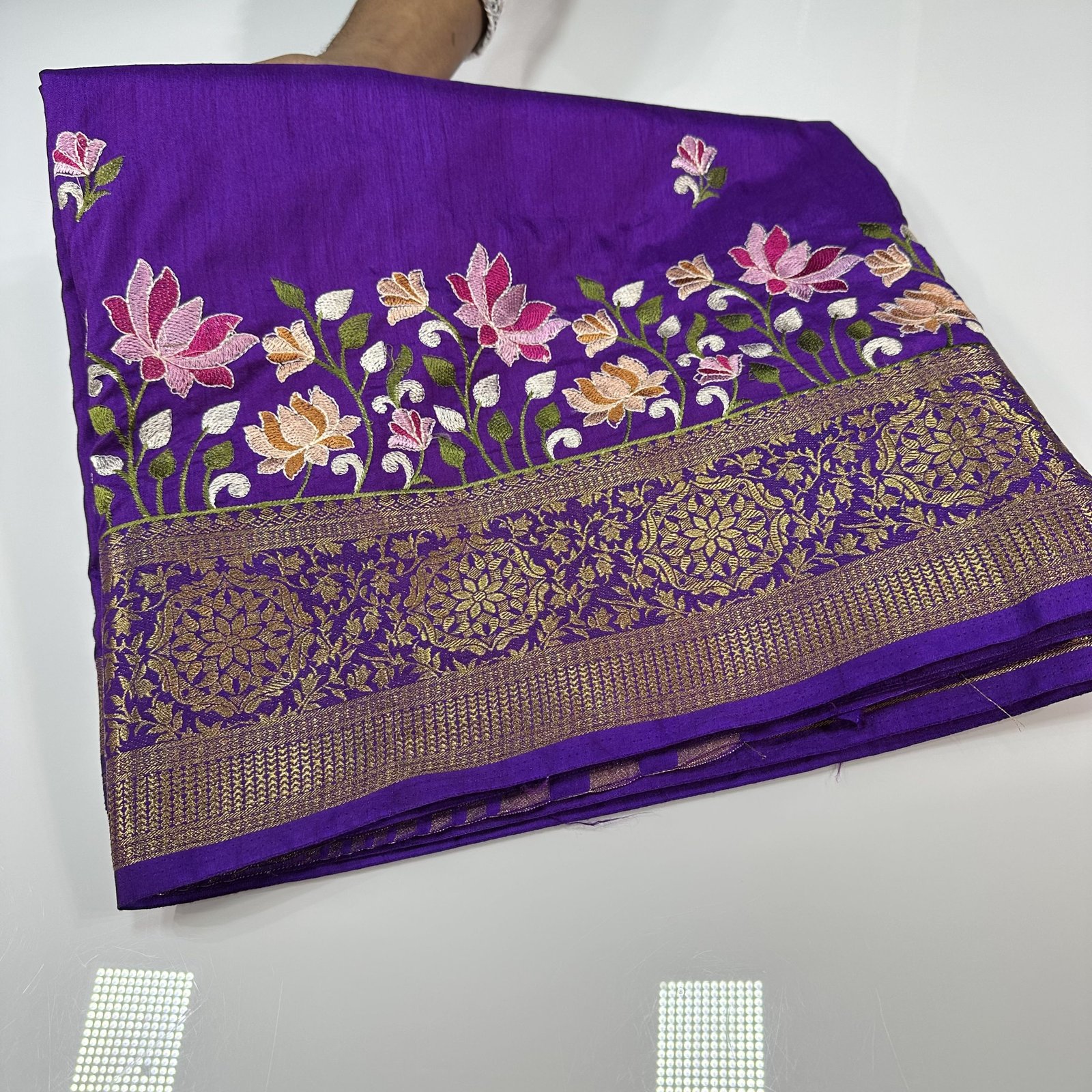 The saree is finished with a fine zari-woven narrow border, beautifully accentuated by intricate embroidery in a jaal pattern along the border region. The soft texture and lightweight drape make it extremely comfortable and easy to carry, while the Banarasi craftsmanship lends a refined festive appeal. An ideal choice for those who appreciate understated luxury with finely detailed artistry.