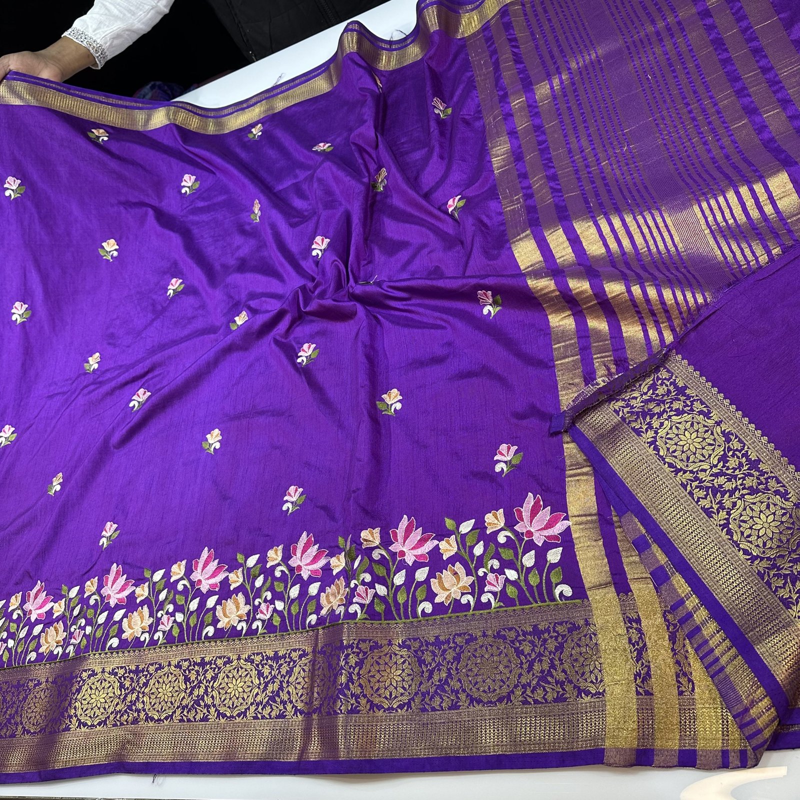 This soft Banarasi dola silk saree reflects timeless elegance with its graceful balance of simplicity and detail. The body of the saree is kept plain and fluid, enhanced with delicate embroidered small booti motifs scattered subtly across the fabric, adding charm without overwhelming the look. The saree is finished with a fine zari-woven narrow border, beautifully accentuated by intricate embroidery in a jaal pattern along the border region. The soft texture and lightweight drape make it extremely comfortable and easy to carry, while the Banarasi craftsmanship lends a refined festive appeal. An ideal choice for those who appreciate understated luxury with finely detailed artistry.