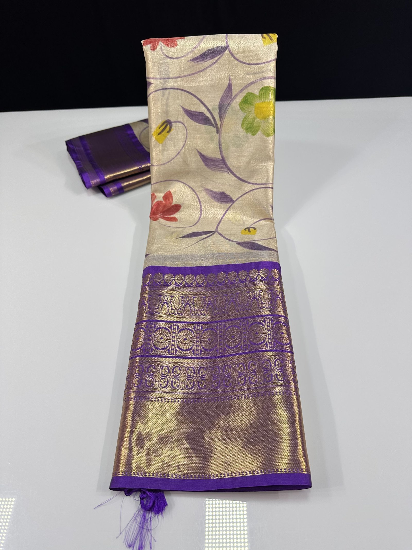 A soft and lightweight Banarasi tissue silk saree featuring an elegant hand-painted jaal pattern flowing across the body. The delicate artwork is beautifully complemented by a contrast border inspired by classic Kanchi designs, adding a refined traditional touch. Easy to drape and graceful in appeal, this saree is perfect for effortless elegance with artistic charm.