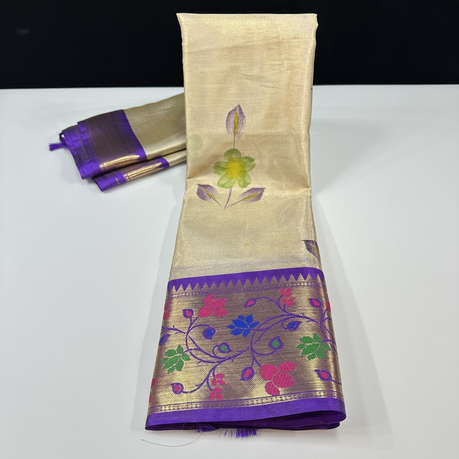 A soft Banarasi tissue silk saree in an elegant ivory shade, beautifully highlighted with hand-painted floral boota work across the body. The look is enhanced by a contrast border featuring intricate Pathani weaving, adding a refined traditional touch. Light, graceful, and easy to drape, this saree is perfect for festive occasions and timeless celebrations.