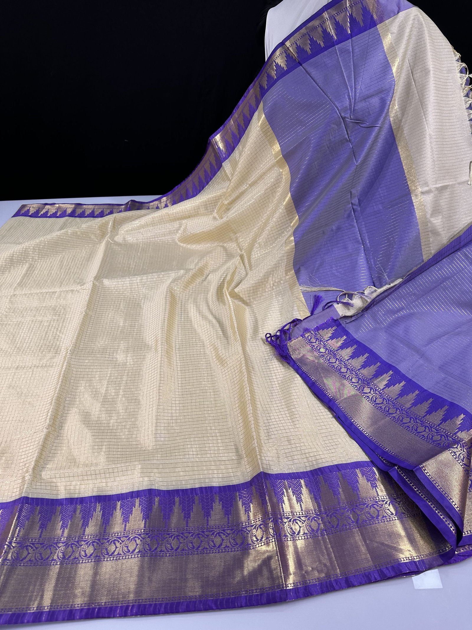 An elegant off-white saree featuring delicate checkered weaving across the body, beautifully complemented by a contrast border. The border is adorned with a classic temple design, intricately woven in rich golden zari, adding a timeless traditional charm perfect for festive and cultural occasions.