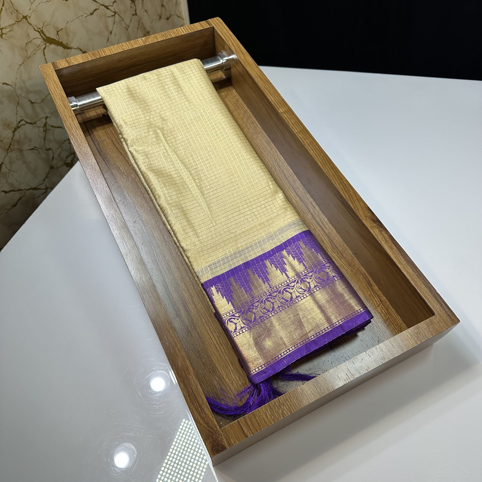 An elegant off-white saree featuring delicate checkered weaving across the body, beautifully complemented by a contrast border. The border is adorned with a classic temple design, intricately woven in rich golden zari, adding a timeless traditional charm perfect for festive and cultural occasions.